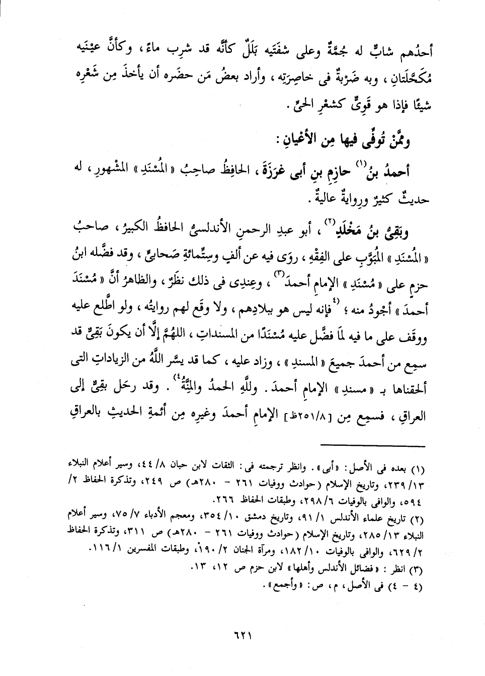 أَبُو عَبْدِ الرَّحْمَنِ الْأَنْدَلُسِيُّ الْحَافِظُ الْكَبِيرُ، صَاحِبُ " الْمُسْنَدِ " الْمُبَوَّبِ عَلَى الْفِقْهِ، رَوَى فِيهِ عَنْ أَلْفٍ وَسِتِّمِائَةِ صَحَابِيٍّ، وَقَدْ فَضَّلَهُ ابْنُ حَزْمٍ عَلَى " مُسْنَدِ " الْإِمَامِ أَحْمَدَ، وَعِنْدِي فِي ذَلِكَ نَظَرٌ، وَالظَّاهِرُ أَنَّ " مُسْنَدَ أَحْمَدَ " أَجْوَدُ مِنْهُ ; فَإِنَّهُ لَيْسَ هُوَ بِبِلَادِهِمْ، وَلَا وَقَعَ لَهُمْ رِوَايَتُهُ، وَلَوِ اطَّلَعَ عَلَيْهِ وَوَقَفَ عَلَى مَا فِيهِ لِمَا فَضَّلَ عَلَيْهِ مُسْنَدًا مِنَ الْمُسْنَدَاتِ، اللَّهُمَّ إِلَّا أَنْ يَكُونَ بَقِيٌّ قَدْ سَمِعَ مِنْ أَحْمَدَ جَمِيعَ " الْمُسْنَدِ "، وَزَادَ عَلَيْهِ، كَمَا قَدْ يَسَّرَ اللَّهُ مِنَ الزِّيَادَاتِ الَّتِي أَلْحَقْنَاهَا بِ " مُسْنَدِ " الْإِمَامِ أَحْمَدَ. وَلِلَّهِ الْحَمْدُ وَالْمِنَّةُ. وَقَدْ رَحَلَ بَقِيٌّ إِلَى الْعِرَاقِ، فَسَمِعَ مِنَ الْإِمَامِ أَحْمَدَ وَغَيْرِهِ مِنْ أَئِمَّةِ الْحَدِيثِ بِالْعِرَاقِ