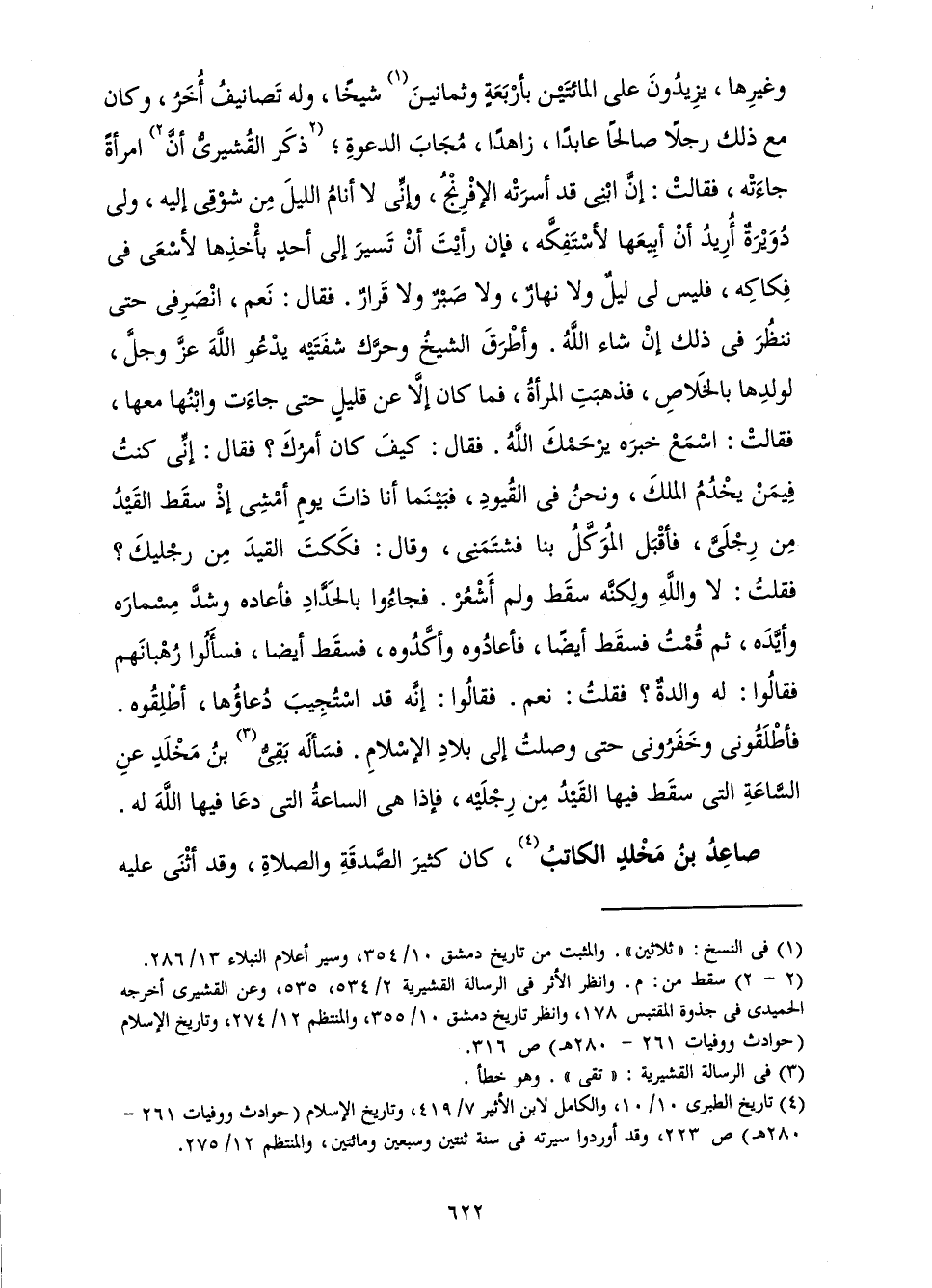 وَغَيْرِهَا، يَزِيدُونَ عَلَى الْمِائَتَيْنِ بِأَرْبَعَةٍ وَثَمَانِينَ شَيْخًا، وَلَهُ تَصَانِيفُ أُخَرُ، وَكَانَ مَعَ ذَلِكَ رَجُلًا صَالِحًا عَابِدًا، زَاهِدًا، مُجَابَ الدَّعْوَةِ ; ذَكَرَ الْقُشَيْرِيُّ أَنَّ امْرَأَةً جَاءَتْهُ، فَقَالَتْ: إِنَّ ابْنِي قَدْ أَسَرَتْهُ الْإِفْرِنْجُ، وَإِنِّي لَا أَنَامُ اللَّيْلَ مِنْ شَوْقِي إِلَيْهِ، وَلِي دُوَيْرَةٌ أُرِيدُ أَنْ أَبِيعَهَا لِأَسْتَفِكَّهُ، فَإِنْ رَأَيْتَ أَنْ تَسِيرَ إِلَى أَحَدٍ يَأْخُذُهَا لِأَسْعَى فِي فِكَاكِهِ، فَلَيْسَ لِي لَيْلٌ وَلَا نَهَارٌ، وَلَا صَبْرٌ وَلَا قَرَارٌ. فَقَالَ: نَعَمْ، انْصَرِفِي حَتَّى نَنْظُرَ فِي ذَلِكَ إِنْ شَاءَ اللَّهُ. وَأَطْرَقَ الشَّيْخُ وَحَرَّكَ شَفَتَيْهِ يَدْعُو اللَّهَ عَزَّ وَجَلَّ لِوَلَدِهَا بِالْخَلَاصِ، فَذَهَبَتِ الْمَرْأَةُ، فَمَا كَانَ إِلَّا عَنْ قَلِيلٍ حَتَّى جَاءَتْ وَابْنُهَا مَعَهَا، فَقَالَتِ: اسْمَعْ خَبَرَهُ يَرْحَمُكَ اللَّهُ. فَقَالَ: كَيْفَ كَانَ أَمْرُكَ؟ فَقَالَ: إِنِّي كُنْتُ فِيمَنْ يَخْدُمُ الْمَلِكَ، وَنَحْنُ فِي الْقُيُودِ، فَبَيْنَمَا أَنَا ذَاتَ يَوْمٍ أَمْشِي إِذْ سَقَطَ الْقَيْدُ مِنْ رِجْلِي، فَأَقْبَلَ الْمُوَكِّلُ بِنَا فَشَتَمَنِي، وَقَالَ: فَكَكْتَ الْقَيْدَ مِنْ رِجْلَيْكَ؟ فَقُلْتُ: لَا وَاللَّهِ وَلَكِنَّهُ سَقَطَ وَلَمْ أَشْعُرْ. فَجَاءُوا بِالْحَدَّادِ فَأَعَادَهُ وَشَدَّ مِسْمَارَهُ وَأَيَّدَهُ، ثُمَّ قُمْتُ فَسَقَطَ أَيْضًا، فَأَعَادُوهُ وَأَكَّدُوهُ، فَسَقَطَ أَيْضًا، فَسَأَلُوا رُهْبَانَهُمْ فَقَالُوا: لَهُ وَالِدَةٌ؟ فَقُلْتُ: نَعَمْ. فَقَالُوا: إِنَّهُ قَدِ اسْتُجِيبَ دُعَاؤُهَا، أَطْلِقُوهُ. فَأَطْلَقُونِي وَخَفَرُونِي حَتَّى وَصَلْتُ إِلَى بِلَادِ الْإِسْلَامِ. فَسَأَلَهُ بَقِيُّ بْنُ مَخْلَدٍ عَنِ السَّاعَةِ الَّتِي سَقَطَ فِيهَا الْقَيْدُ مِنْ رِجْلَيْهِ، فَإِذَا هِيَ السَّاعَةُ الَّتِي دَعَا فِيهَا اللَّهَ لَهُ.