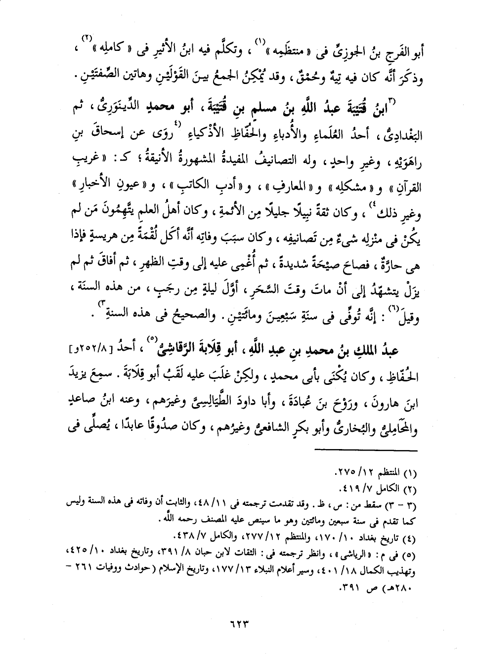 ابْنُ قُتَيْبَةَ عَبْدُ اللَّهِ بْنُ مُسْلِمِ بْنِ قُتَيْبَةَ، أَبُو مُحَمَّدٍ الدِّينَوَرِيُّ، ثُمَّ الْبَغْدَادِيُّ، أَحَدُ الْعُلَمَاءِ وَالْأُدَبَاءِ وَالْحُفَّاظِ الْأَذْكِيَاءِ رَوَى عَنْ إِسْحَاقَ بْنِ رَاهَوَيْهِ وَغَيْرِ وَاحِدٍ، وَلَهُ التَّصَانِيفُ الْمُفِيدَةُ الْمَشْهُورَةُ الْأَنِيقَةُ ; كَ: " غَرِيبِ الْقُرْآنِ " وَ " مُشْكِلِهِ " وَ " الْمَعَارِفِ "، وَ " أَدَبِ الْكَاتِبِ "، وَ " عُيُونِ الْأَخْبَارِ " وَغَيْرِ ذَلِكَ، وَكَانَ ثِقَةً نَبِيلًا جَلِيلًا مِنَ الْأَئِمَّةِ، وَكَانَ أَهْلُ الْعِلْمِ يَتَّهِمُونَ مَنْ لَمْ يَكُنْ فِي مَنْزِلِهِ شَيْءٌ مِنْ تَصَانِيفِهِ، وَكَانَ سَبَبَ وَفَاتِهِ أَنَّهُ أَكَلَ لُقْمَةً مِنْ هَرِيسَةٍ فَإِذَا هِيَ حَارَّةٌ، فَصَاحَ صَيْحَةً شَدِيدَةً، ثُمَّ أُغْمِيَ عَلَيْهِ إِلَى وَقْتِ الظُّهْرِ، ثُمَّ أَفَاقَ ثُمَّ لَمْ يَزَلْ يَتَشَهَّدُ إِلَى أَنْ مَاتَ وَقْتَ السَّحَرِ، أَوَّلَ لَيْلَةٍ مِنْ رَجَبٍ، مِنْ هَذِهِ السَّنَةِ، وَقِيلَ: إِنَّهُ تُوُفِّيَ فِي سَنَةِ سَبْعِينَ وَمِائَتَيْنِ. وَالصَّحِيحُ فِي هَذِهِ السَّنَةِ.