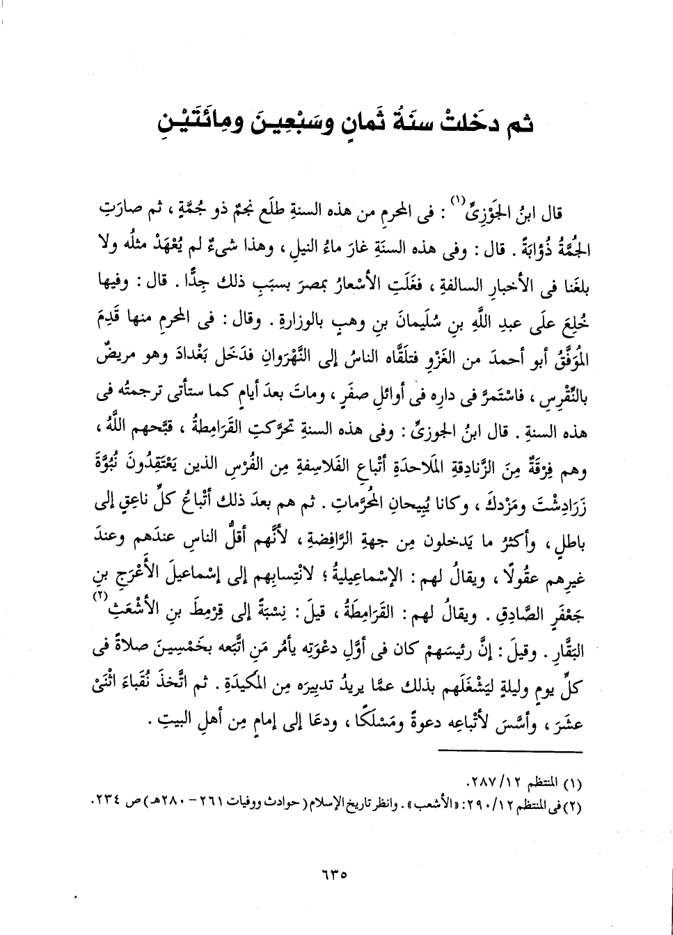قَالَ ابْنُ الْجَوْزِيِّ: فِي الْمُحَرَّمِ مِنْ هَذِهِ السَّنَةِ طَلَعَ نَجْمٌ ذُو جُمَّةٍ، ثُمَّ صَارَتِ الْجُمَّةُ ذُؤَابَةً. قَالَ: وَفِي هَذِهِ السَّنَةِ غَارَ مَاءُ النِّيلِ وَهَذَا شَيْءٌ لَمْ يُعْهَدْ مِثْلُهُ وَلَا بَلَغَنَا فِي الْأَخْبَارِ السَّالِفَةِ، فَغَلَتِ الْأَسْعَارُ بِمِصْرَ بِسَبَبِ ذَلِكَ جِدًّا. قَالَ: وَفِيهَا خُلِعَ عَلَى عَبْدِ اللَّهِ بْنِ سُلَيْمَانَ بْنِ وَهْبٍ بِالْوِزَارَةِ. وَقَالَ: فِي الْمُحَرَّمِ مِنْهَا قَدِمَ الْمُوَفَّقُ أَبُو أَحْمَدَ مِنَ الْغَزْوِ فَتَلَقَّاهُ النَّاسُ إِلَى النَّهْرَوَانِ فَدَخَلَ بَغْدَادَ وَهُوَ مَرِيضٌ بِالنِّقْرِسِ، فَاسْتَمَرَّ فِي دَارِهِ فِي أَوَائِلِ صَفَرٍ، وَمَاتَ بَعْدَ أَيَّامٍ كَمَا سَتَأْتِي تَرْجَمَتُهُ فِي هَذِهِ السَّنَةِ. قَالَ ابْنُ الْجَوْزِيِّ: وَفِي هَذِهِ السَّنَةِ تَحَرَّكَتِ الْقَرَامِطَةُ، قَبَّحَهُمُ اللَّهُ، وَهُمْ فِرْقَةٌ مِنَ الزَّنَادِقَةِ الْمَلَاحِدَةِ أَتْبَاعِ الْفَلَاسِفَةِ مِنَ الْفُرْسِ الَّذِينَ يَعْتَقِدُونَ نُبُوَّةَ زَرَادِشْتَ وَمَزْدَكَ، وَكَانَا يُبِيحَانِ الْمُحَرَّمَاتِ، ثُمَّ هُمْ بَعْدَ ذَلِكَ أَتْبَاعُ كُلِّ نَاعِقٍ إِلَى بَاطِلٍ، وَأَكْثَرُ مَا يَدْخُلُونَ مِنْ جِهَةِ الرَّافِضَةِ، لِأَنَّهُمْ أَقَلُّ النَّاسِ عِنْدَهُمْ وَعِنْدَ غَيْرِهِمْ عُقُولًا، وَيُقَالُ لَهُمُ: الْإِسْمَاعِيلِيَّةُ ; لِانْتِسَابِهِمْ إِلَى إِسْمَاعِيلَ الْأَعْرَجِ بْنِ جَعْفَرٍ الصَّادِقِ. وَيُقَالُ لَهُمُ: الْقَرَامِطَةُ، قِيلَ: نِسْبَةً إِلَى قِرْمِطِ بْنِ الْأَشْعَثِ الْبَقَّارِ. وَقِيلَ: إِنَّ رَئِيسَهُمْ كَانَ فِي أَوَّلِ دَعْوَتِهِ يَأْمُرُ مَنِ اتَّبَعَهُ بِخَمْسِينَ صَلَاةً فِي كُلِّ يَوْمٍ وَلَيْلَةٍ لِيَشْغَلَهُمْ بِذَلِكَ عَمَّا يُرِيدُ تَدْبِيرَهُ مِنَ الْمَكِيدَةِ. ثُمَّ اتَّخَذَ نُقَبَاءَ اثْنَيْ عَشَرَ، وَأَسَّسَ لِأَتْبَاعِهِ دَعْوَةً وَمَسْلَكًا، وَدَعَا إِلَى إِمَامٍ مِنْ أَهْلِ الْبَيْتِ.