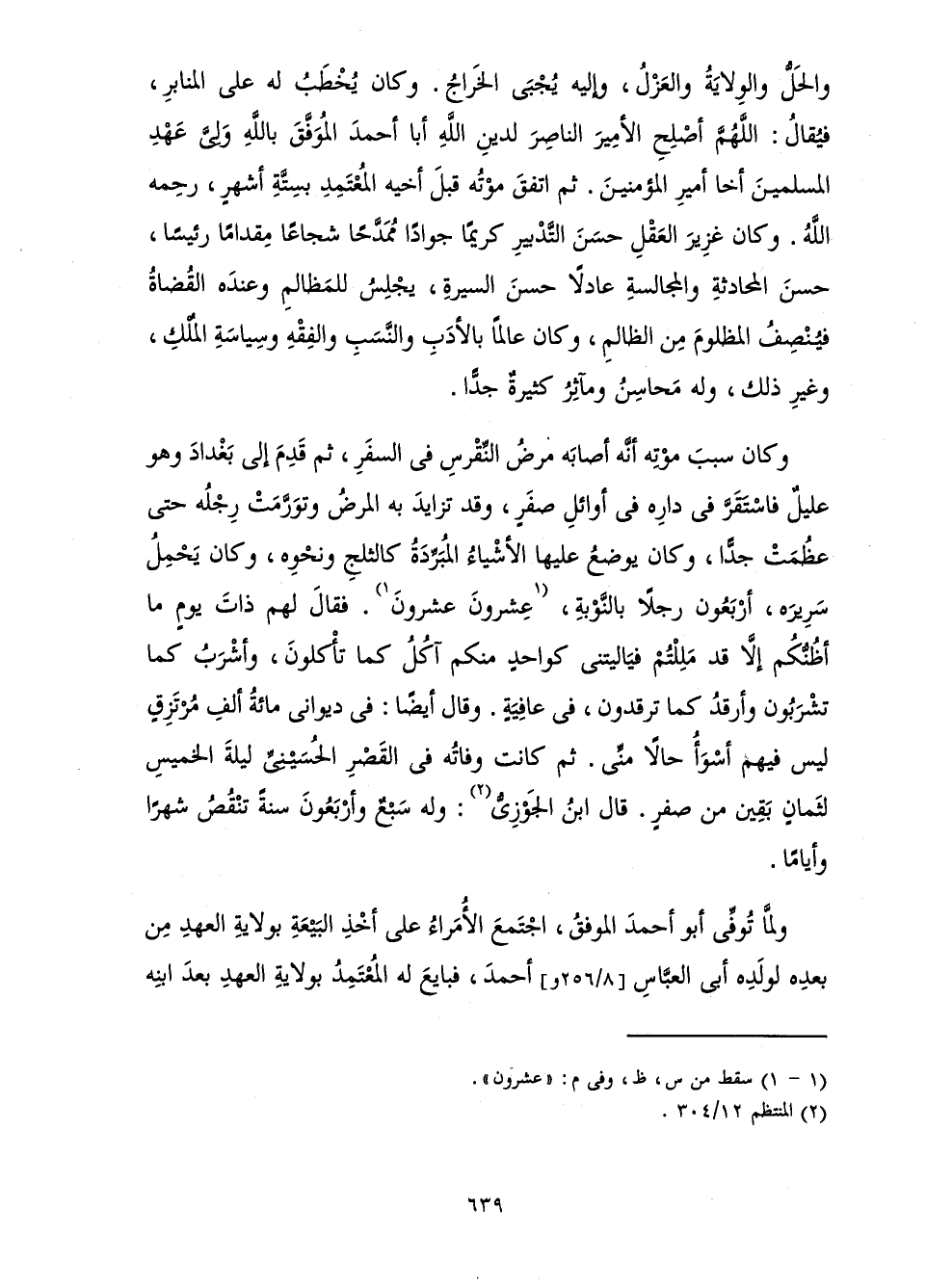 وَالْحَلُّ وَالْوِلَايَةُ وَالْعَزْلُ، وَإِلَيْهِ يُجْبَى الْخَرَاجُ. وَكَانَ يُخْطَبُ لَهُ عَلَى الْمَنَابِرِ، فَيُقَالُ: اللَّهُمَّ أَصْلِحِ الْأَمِيرَ النَّاصِرَ لِدِينِ اللَّهِ أَبَا أَحْمَدَ الْمُوَفَّقَ بِاللَّهِ وَلِيَّ عَهْدِ الْمُسْلِمِينَ أَخَا أَمِيرِ الْمُؤْمِنِينَ. ثُمَّ اتَّفَقَ مَوْتُهُ قَبْلَ أَخِيهِ الْمُعْتَمِدِ بِسِتَّةِ أَشْهُرٍ، رَحِمَهُ اللَّهُ. وَكَانَ غَزِيرَ الْعَقْلِ حَسَنَ التَّدْبِيرِ كَرِيمًا جَوَادًا مُمَدَّحًا شُجَاعًا مِقْدَامًا رَئِيسًا، حَسَنَ الْمُحَادَثَةِ وَالْمُجَالَسَةِ عَادِلًا حَسَنَ السِّيرَةِ، يَجْلِسُ لِلْمَظَالِمِ وَعِنْدَهُ الْقُضَاةُ فَيُنْصِفُ الْمَظْلُومَ مِنَ الظَّالِمِ، وَكَانَ عَالِمًا بِالْأَدَبِ وَالنَّسَبِ وَالْفِقْهِ وَسِيَاسَةِ الْمُلْكِ، وَغَيْرِ ذَلِكَ، وَلَهُ مَحَاسِنُ وَمَآثِرُ كَثِيرَةٌ جِدًّا.