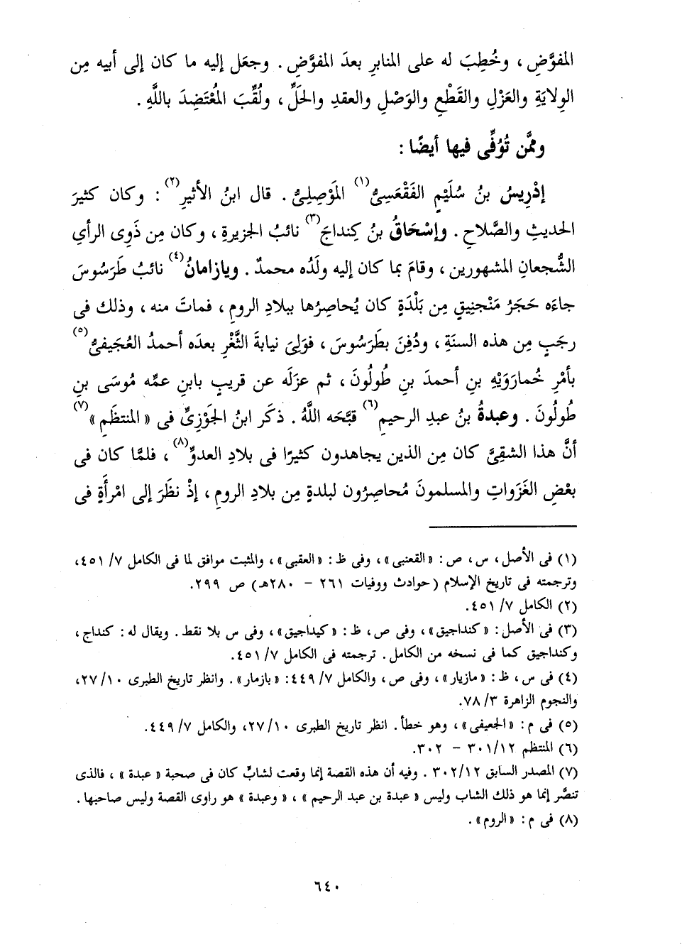 إِدْرِيسُ بْنُ سُلَيْمٍ الْفَقْعَسِيُّ الْمَوْصِلِيُّ. قَالَ ابْنُ الْأَثِيرِ: وَكَانَ كَثِيرَ الْحَدِيثِ وَالصَّلَاحِ. وَإِسْحَاقُ بْنُ كِنْدَاجَ نَائِبُ الْجَزِيرَةِ وَكَانَ مِنْ ذَوِي الرَّأْيِ الشُّجْعَانِ الْمَشْهُورِينَ، وَقَامَ بِمَا كَانَ إِلَيْهِ وَلَدُهُ مُحَمَّدٌ. وَيَازَامَانُ نَائِبُ طَرَسُوسَ جَاءَهُ حَجَرُ مَنْجَنِيقٍ مِنْ بَلْدَةٍ كَانَ يُحَاصِرُهَا بِبِلَادِ الرُّومِ، فَمَاتَ مِنْهُ، وَذَلِكَ فِي رَجَبٍ مِنْ هَذِهِ السَّنَةِ، وَدُفِنَ بِطَرَسُوسَ، فَوَلِيَ نِيَابَةَ الثَّغْرِ بَعْدَهُ أَحْمَدُ الْعُجَيْفِيُّ بِأَمْرِ خُمَارَوَيْهِ بْنِ أَحْمَدَ بْنِ طُولُونَ، ثُمَّ عَزَلَهُ عَنْ قَرِيبٍ بِابْنِ عَمِّهِ مُوسَى بْنِ طُولُونَ. وَعَبْدَةُ بْنُ عَبْدِ الرَّحِيمِ قَبَّحَهُ اللَّهُ. ذَكَرَ ابْنُ الْجَوْزِيِّ فِي " الْمُنْتَظَمِ " أَنَّ هَذَا الشَّقِيَّ كَانَ مِنَ الَّذِينَ يُجَاهِدُونَ كَثِيرًا فِي بِلَادِ الْعَدُوِّ، فَلَمَّا كَانَ فِي بَعْضِ الْغَزَوَاتِ وَالْمُسْلِمُونَ مُحَاصِرُونَ لِبَلْدَةٍ مِنْ بِلَادِ الرُّومِ، إِذْ نَظَرَ إِلَى امْرَأَةٍ فِي