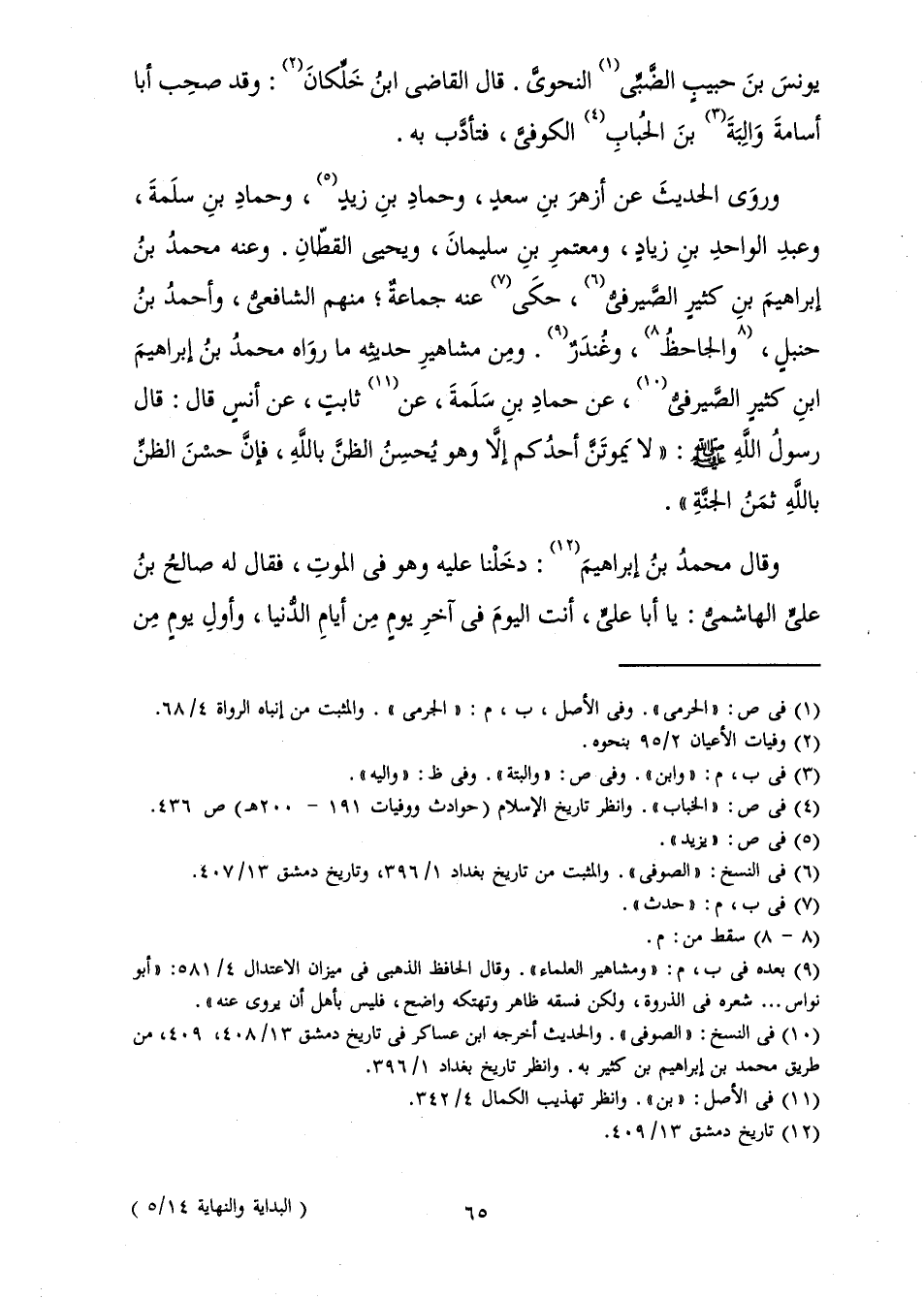 وَقَالَ مُحَمَّدُ بْنُ إِبْرَاهِيمَ: دَخَلْنَا عَلَيْهِ وَهُوَ فِي الْمَوْتِ فَقَالَ لَهُ صَالِحُ بْنُ عَلِيٍّ الْهَاشِمِيُّ: يَا أَبَا عَلِيٍّ، أَنْتَ الْيَوْمَ فِي آخِرِ يَوْمٍ مِنْ أَيَّامِ الدُّنْيَا، وَأَوَّلِ يَوْمٍ مِنْ