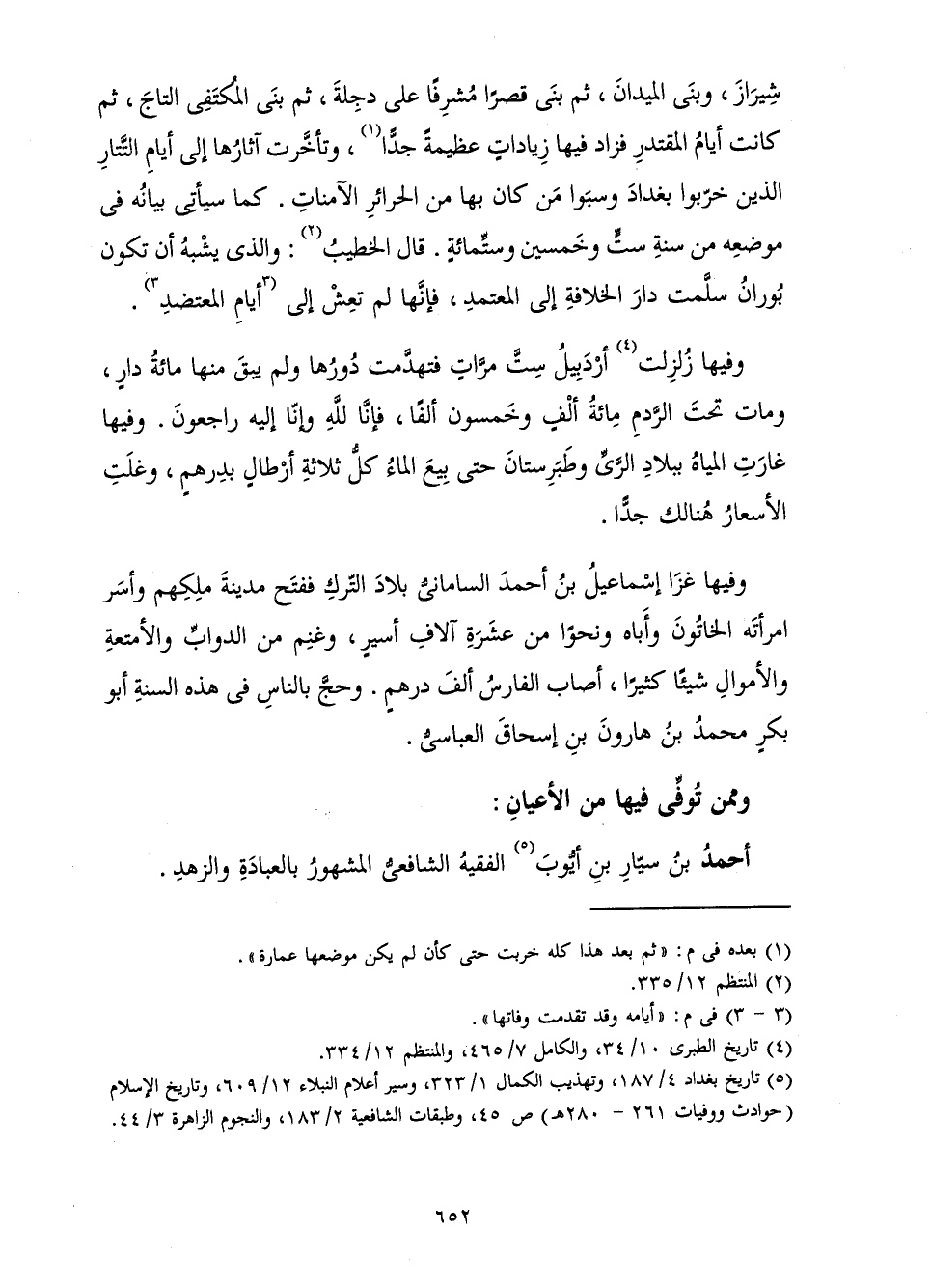 شِيرَازَ وَبَنَى الْمَيْدَانَ ثُمَّ بَنَى قَصْرًا مُشْرِفًا عَلَى دِجْلَةَ، ثُمَّ بَنَى الْمُكْتَفِي التَّاجَ، ثُمَّ كَانَتْ أَيَّامُ الْمُقْتَدِرِ فَزَادَ فِيهَا زِيَادَاتٍ عَظِيمَةً جِدًّا، وَتَأَخَّرَتْ آثَارُهَا إِلَى أَيَّامِ التَّتَارِ الَّذِينَ خَرَّبُوا بَغْدَادَ وَسَبَوْا مَنْ كَانَ بِهَا مِنَ الْحَرَائِرِ الْآمِنَاتِ، كَمَا سَيَأْتِي بَيَانُهُ فِي مَوْضِعِهِ مِنْ سَنَةِ سِتٍّ وَخَمْسِينَ وَسِتِّمِائَةٍ. قَالَ الْخَطِيبُ: وَالَّذِي يُشْبِهُ أَنْ تَكُونَ بُوَرَانُ سَلَّمَتْ دَارَ الْخِلَافَةِ إِلَى الْمُعْتَمِدِ، فَإِنَّهَا لَمْ تَعِشْ إِلَى أَيَّامِ الْمُعْتَضِدِ.