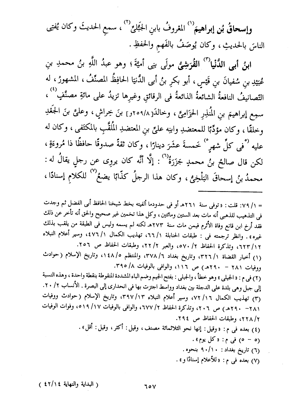 مَوْلَى بَنِي أُمَيَّةَ وَهُوَ عَبْدُ اللَّهِ بْنُ مُحَمَّدِ بْنِ عُبَيْدِ بْنِ سُفْيَانَ بْنِ قَيْسٍ أَبُو بَكْرٍ ابْنُ أَبِي الدُّنْيَا الْحَافِظُ الْمُصَنِّفُ الْمَشْهُورُ، لَهُ التَّصَانِيفُ النَّافِعَةُ الشَّائِعَةُ الذَّائِعَةُ فِي الرَّقَائِقِ وَغَيْرِهَا، تَزِيدُ عَلَى مِائَةِ مُصَنَّفٍ. سَمِعَ إِبْرَاهِيمَ بْنَ الْمُنْذِرِ الْحِزَامِيَّ وَخَالِدَ بْنَ خِرَاشٍ وَعَلِيَّ بْنَ الْجَعْدِ وَخَلْقًا، وَكَانَ مُؤَدِّبًا لِلْمُعْتَضِدِ وَابْنِهِ عَلِيِّ ابْنِ الْمُعْتَضِدِ الْمُلَقَّبِ بِالْمُكْتَفِي، وَكَانَ لَهُ عَلَيْهِ فِي كُلِّ شَهْرٍ خَمْسَةَ عَشَرَ دِينَارًا وَكَانَ ثِقَةً صَدُوقًا حَافِظًا ذَا مُرُوءَةٍ، لَكِنْ قَالَ صَالِحُ بْنُ مُحَمَّدٍ جَزَرَةُ: إِلَّا أَنَّهُ كَانَ يَرْوِي عَنْ رَجُلٍ يُقَالُ لَهُ مُحَمَّدُ بْنُ إِسْحَاقَ الْبَلْخِيُّ، وَكَانَ هَذَا الرَّجُلُ كَذَّابًا يَضَعُ لِلْكَلَامِ إِسْنَادًا،