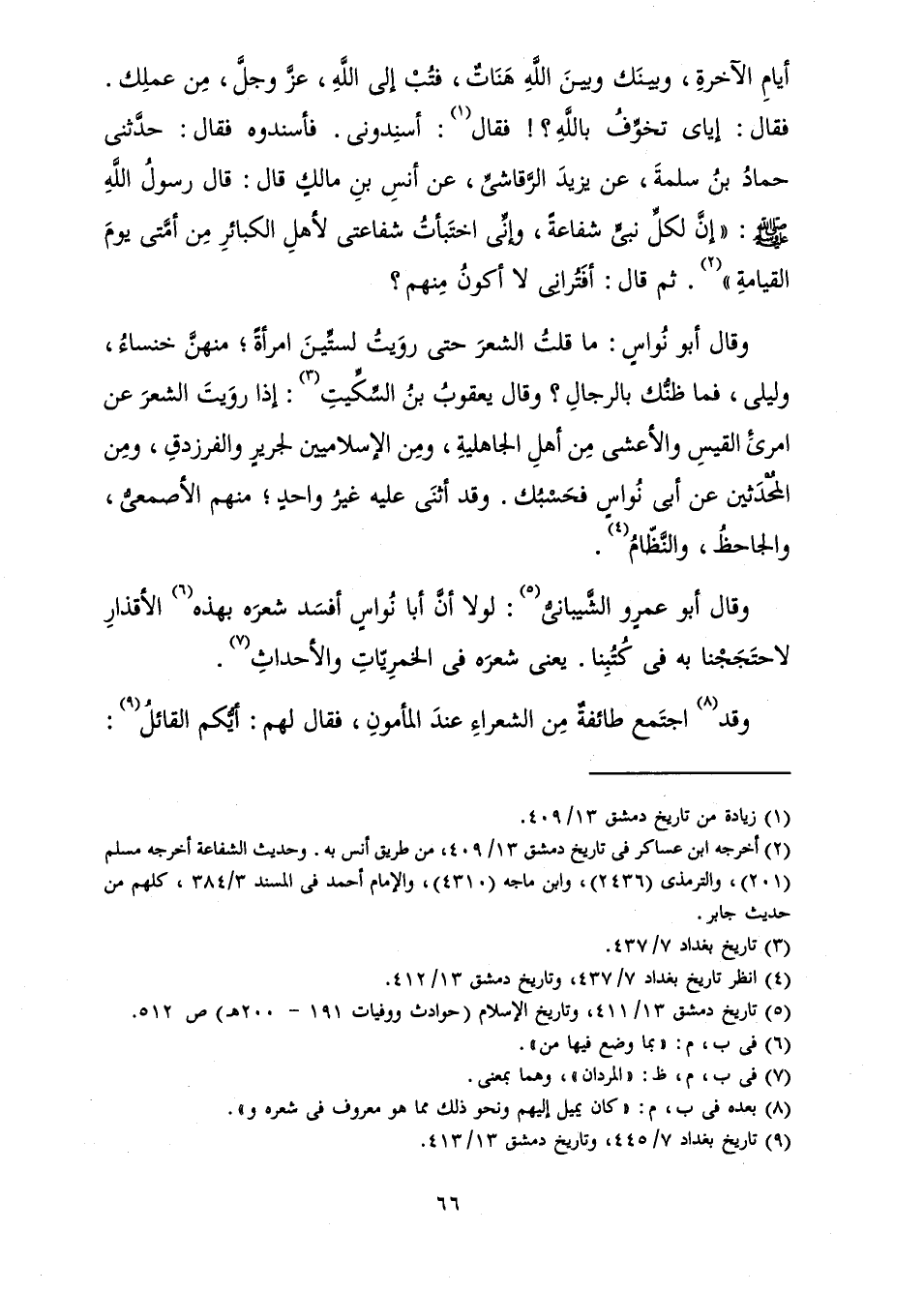 أَيَّامِ الْآخِرَةِ، وَبَيْنَكَ وَبَيْنَ اللَّهِ هَنَاتٌ، فَتُبْ إِلَى اللَّهِ - عَزَّ وَجَلَّ - مِنْ عَمَلِكَ. فَقَالَ: إِيَّاىَ تُخَوِّفُ بِاللَّهِ؟ ! فَقَالَ: أَسْنِدُونِي. فَأَسْنَدُوهُ. فَقَالَ: حَدَّثَنِي حَمَّادُ بْنُ سَلَمَةَ عَنْ يَزِيدَ الرَّقَاشِيِّ، عَنْ أَنَسِ بْنِ مَالِكٍ قَالَ: قَالَ رَسُولُ اللَّهِ صَلَّى اللَّهُ عَلَيْهِ وَسَلَّمَ: «إِنَّ لِكُلِّ نَبِيٍّ شَفَاعَةً، وَإِنِّي اخْتَبَأْتُ شَفَاعَتِي لِأَهْلِ الْكَبَائِرِ مِنْ أُمَّتِي يَوْمَ الْقِيَامَةِ» ثُمَّ قَالَ: أَفَتُرَانِي لَا أَكُونُ مِنْهُمْ؟