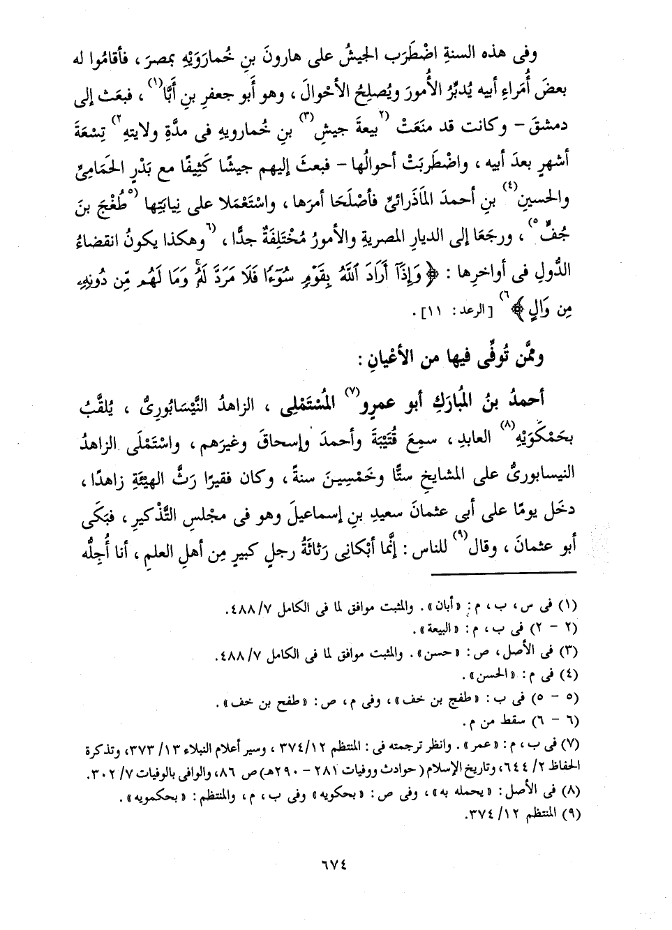 وَفِي هَذِهِ السَّنَةِ اضْطَرَبَ الْجَيْشُ عَلَى هَارُونَ بْنِ خُمَارَوَيْهِ بِمِصْرَ فَأَقَامُوا لَهُ بَعْضَ أُمَرَاءِ أَبِيهِ يُدَبِّرُ الْأُمُورَ وَيُصْلِحُ الْأَحْوَالَ وَهُوَ أَبُو جَعْفَرِ بْنُ أَبَّا فَبَعَثَ إِلَى دِمَشْقَ وَكَانَتْ قَدْ مَنَعَتْ بَيْعَةَ جَيْشِ ابْنِ خُمَارَوَيْهِ فِي مُدَّةِ وِلَايَتِهِ تِسْعَةَ أَشْهُرٍ بَعْدَ أَبِيهِ وَاضْطَرَبَتْ أَحْوَالُهَا فَبَعَثَ إِلَيْهِمْ جَيْشًا كَثِيفًا مَعَ بَدْرٍ الْحَمَامِيِّ وَالْحُسَيْنِ بْنِ أَحْمَدَ الْمَاذَرَائِيِّ فَأَصْلَحَا أَمْرَهَا وَاسْتَعْمَلَا عَلَى نِيَابَتِهَا طُغْجَ بْنَ جُفٍّ وَرَجَعَا إِلَى الدِّيَارِ الْمِصْرِيَّةِ. وَالْأُمُورُ مُخْتَلِفَةٌ جِدًّا، وَهَكَذَا يَكُونُ انْقِضَاءُ الدُّوَلِ فِي أَوَاخِرِهَا، {وَإِذَا أَرَادَ اللَّهُ بِقَوْمٍ سُوءًا فَلَا مَرَدَّ لَهُ وَمَا لَهُمْ مِنْ دُونِهِ مِنْ وَالٍ} [الرعد: 11]