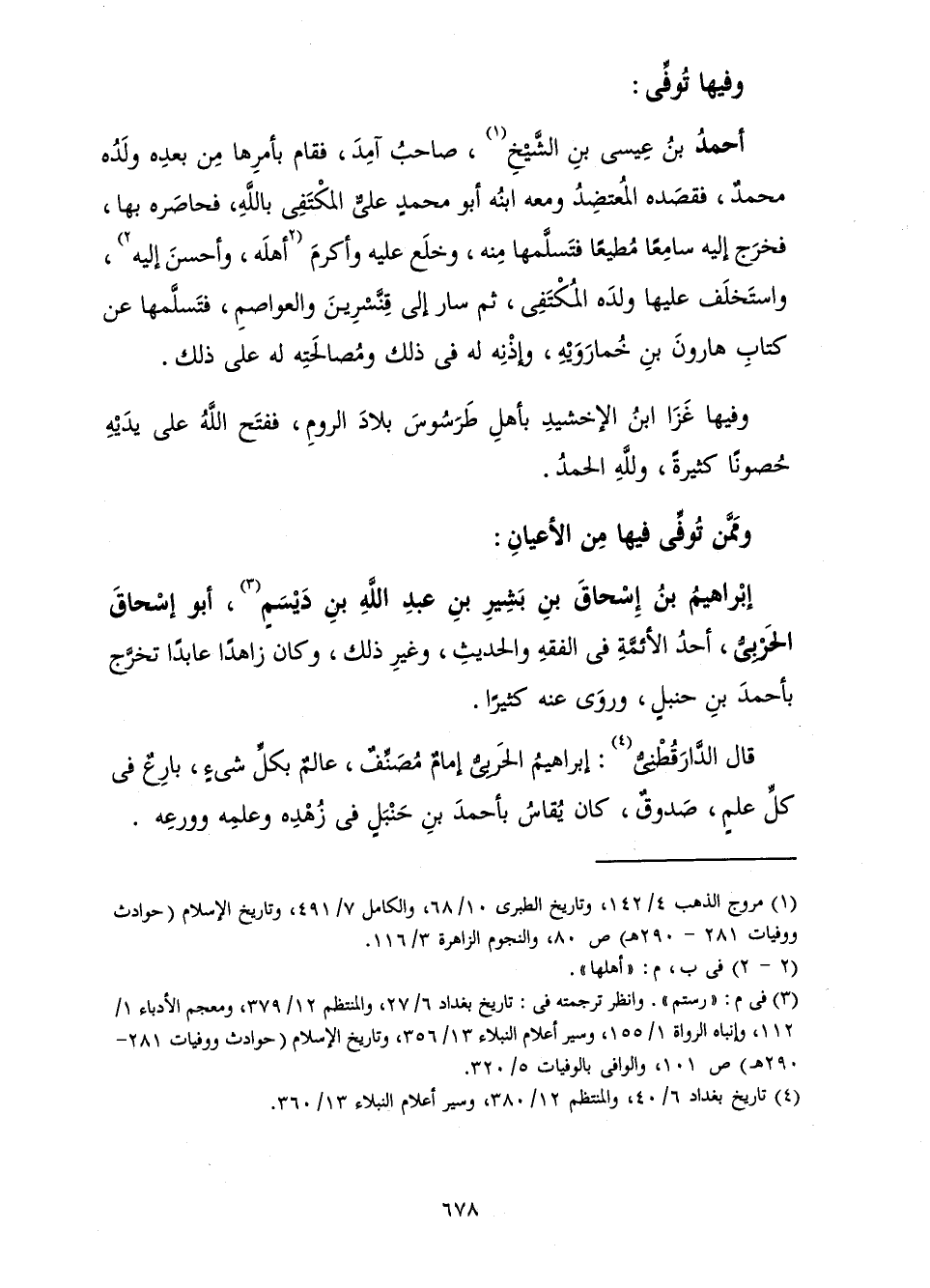 أَحْمَدُ بْنُ عِيسَى بْنِ الشَّيْخِ صَاحِبُ آمِدَ فَقَامَ بِأَمْرِهَا مِنْ بَعْدِهِ وَلَدُهُ مُحَمَّدٌ فَقَصَدَهُ الْمُعْتَضِدُ وَمَعَهُ ابْنُهُ أَبُو مُحَمَّدٍ عَلِيٌّ الْمُكْتَفِي بِاللَّهِ فَحَاصَرَهُ بِهَا فَخَرَجَ إِلَيْهِ سَامِعًا مُطِيعًا فَتَسَلَّمَهَا مِنْهُ وَخَلَعَ عَلَيْهِ وَأَكْرَمَ أَهْلَهُ وَأَحْسَنَ إِلَيْهِ وَاسْتَخْلَفَ عَلَيْهَا وَلَدَهُ الْمُكْتَفِي ثُمَّ سَارَ إِلَى قِنِّسْرِينَ وَالْعَوَاصِمِ فَتَسَلَّمَهَا عَنْ كِتَابِ هَارُونَ بْنِ خُمَارَوَيْهِ وَإِذْنِهِ لَهُ فِي ذَلِكَ وَمُصَالَحَتِهِ لَهُ عَلَى ذَلِكَ.