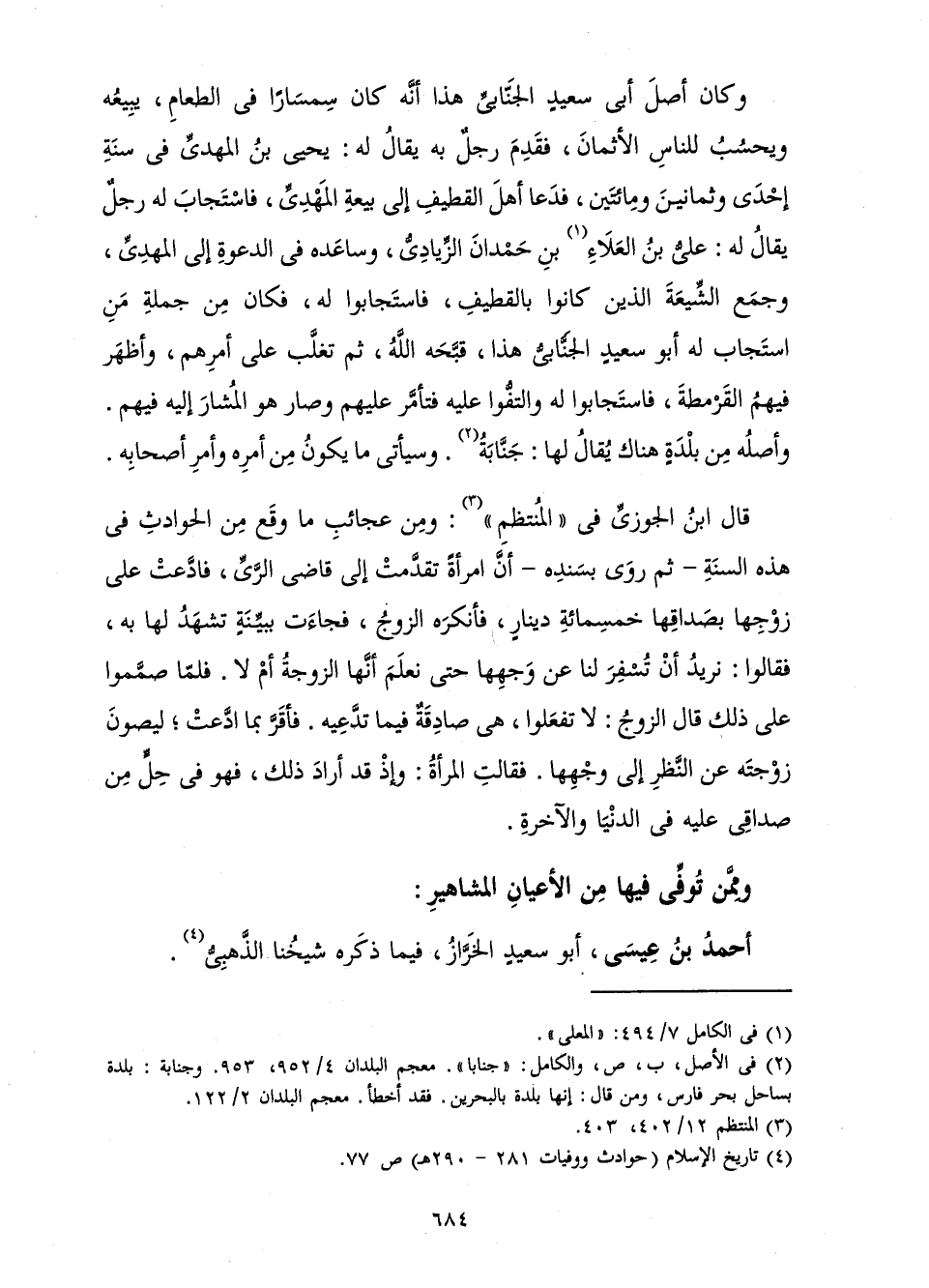 وَكَانَ أَصْلُ أَبِي سَعِيدٍ الْجَنَّابِيِّ هَذَا أَنَّهُ كَانَ سِمْسَارًا فِي الطَّعَامِ يَبِيعُهُ وَيَحْسِبُ لِلنَّاسِ الْأَثْمَانَ فَقَدِمَ رَجُلٌ بِهِ يُقَالُ لَهُ يَحْيَى بْنُ الْمَهْدِيِّ فِي سَنَةِ إِحْدَى وَثَمَانِينَ وَمِائَتَيْنِ فَدَعَا أَهْلَ الْقَطِيفِ إِلَى بَيْعَةِ الْمَهْدِيِّ فَاسْتَجَابَ لَهُ رَجُلٌ يُقَالُ لَهُ عَلِيُّ بْنُ الْعَلَاءِ بْنِ حَمْدَانَ الزِّيَادِيُّ وَسَاعَدَهُ فِي الدَّعْوَةِ إِلَى الْمَهْدِيِّ وَجَمَعَ الشِّيعَةَ الَّذِينَ كَانُوا بِالْقَطِيفِ فَاسْتَجَابُوا لَهُ، فَكَانَ مِنْ جُمْلَةِ مَنِ اسْتَجَابَ أَبُو سَعِيدٍ الْجَنَّابِيُّ هَذَا - قَبَّحَهُ اللَّهُ - ثُمَّ تَغَلَّبَ عَلَى أَمْرِهِمْ وَأَظْهَرَ فِيهِمُ الْقَرْمَطَةَ فَاسْتَجَابُوا لَهُ وَالْتَفُّوا عَلَيْهِ فَتَأَمَّرَ عَلَيْهِمْ وَصَارَ هُوَ الْمُشَارَ إِلَيْهِ فِيهِمْ. وَأَصْلُهُ مِنْ بَلْدَةٍ هُنَاكَ يُقَالُ لَهَا جَنَّابَةُ وَسَيَأْتِي مَا يَكُونُ مِنْ أَمْرِهِ وَأَمْرِ أَصْحَابِهِ.