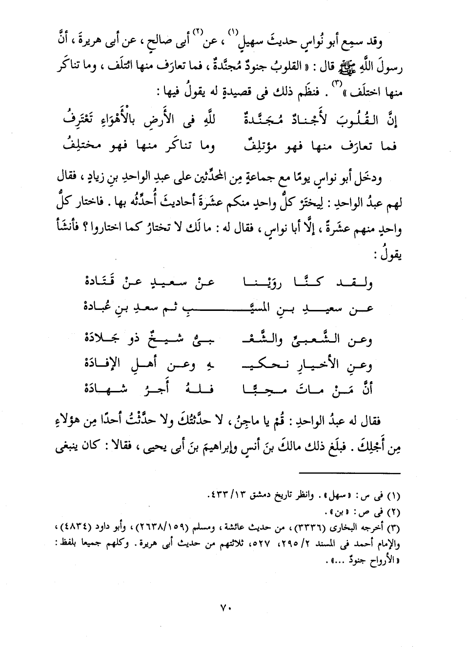 وَقَدْ سَمِعَ أَبُو نُوَاسٍ حَدِيثَ سُهَيْلٍ، عَنْ أَبِي صَالِحٍ، عَنْ أَبِي هُرَيْرَةَ، أَنَّ رَسُولَ اللَّهِ صَلَّى اللَّهُ عَلَيْهِ وَسَلَّمَ قَالَ: «الْقُلُوبُ جُنُودٌ مُجَنَّدَةٌ، فَمَا تَعَارَفَ مِنْهَا ائْتَلَفَ وَمَا تَنَاكَرَ مِنْهَا اخْتَلَفَ» فَنَظَمَ ذَلِكَ فِي قَصِيدَةٍ لَهُ يَقُولُ فِيهَا: