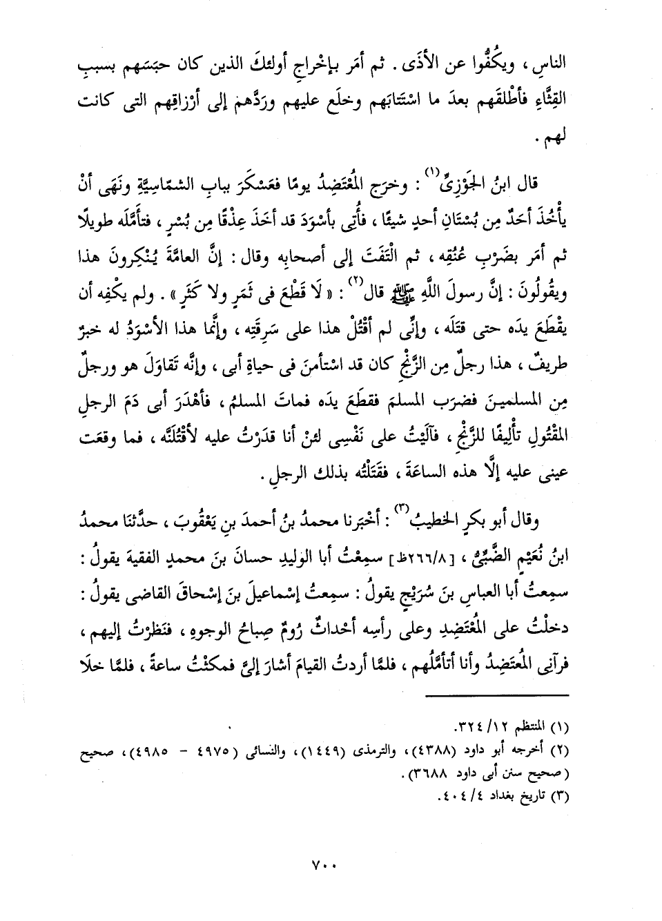 قَالَ ابْنُ الْجَوْزِيِّ: وَخَرَجَ الْمُعْتَضِدُ يَوْمًا فَعَسْكَرَ بِبَابِ الشَّمَّاسِيَّةِ وَنَهَى أَنْ يَأْخُذَ أَحَدٌ مِنْ بُسْتَانِ أَحَدٍ شَيْئًا فَأُتِيَ بِأَسْوَدَ قَدْ أَخَذَ عِذْقًا مَنْ بُسْرٍ فَتَأَمَّلَهُ طَوِيلًا ثُمَّ أَمَرَ بِضَرْبِ عُنُقِهِ ثُمَّ الْتَفَتَ إِلَى أَصْحَابِهِ وَقَالَ: إِنَّ الْعَامَّةَ يُنْكِرُونَ هَذَا وَيَقُولُونَ: إِنَّ رَسُولَ اللَّهِ صَلَّى اللَّهُ عَلَيْهِ وَسَلَّمَ قَالَ: «لَا قَطْعَ فِي ثَمَرٍ وَلَا كَثَرٍ» وَلَمْ يَكْفِهِ أَنْ يَقْطَعَ يَدَهُ حَتَّى قَتَلَهُ وَإِنِّي لَمْ أَقْتُلْ هَذَا عَلَى سَرِقَتِهِ وَإِنَّمَا هَذَا الْأَسْوَدُ لَهُ خَبَرٌ طَرِيفٌ، هَذَا رَجُلٌ مِنَ الزَّنْجِ كَانَ قَدِ اسْتَأْمَنَ فِي حَيَاةِ أَبِي، وَإِنَّهُ تَقَاوَلَ هُوَ وَرَجُلٌ مِنَ الْمُسْلِمِينَ فَضَرَبَ الْمُسْلِمَ فَقَطَعَ يَدَهُ فَمَاتَ الْمُسْلِمُ فَأَهْدَرَ أَبِي دَمَ الرَّجُلِ الْمَقْتُولِ تَأْلِيفًا لِلزَّنْجِ فَآلَيْتُ عَلَى نَفْسِي لَئِنْ أَنَا قَدَرْتُ عَلَيْهِ لَأَقْتُلَنَّهُ، فَمَا وَقَعَتْ عَيْنِي عَلَيْهِ إِلَّا هَذِهِ السَّاعَةَ، فَقَتَلْتُهُ بِذَلِكَ الرَّجُلِ.