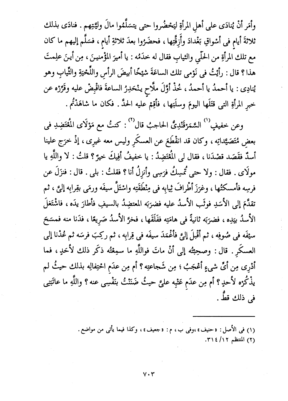 وَأَمَرَ أَنْ يُنَادَى عَلَى أَهْلِ الْمَرْأَةِ لِيَحْضُرُوا حَتَّى يَتَسَلَّمُوا مَالَ وَلَيَّتِهِمْ، فَنَادَى بِذَلِكَ ثَلَاثَةَ أَيَّامٍ فِي أَسْوَاقِ بَغْدَادَ وَأَزِقَّتِهَا، فَحَضَرُوا بَعْدَ ثَلَاثَةِ أَيَّامٍ فَسَلَّمَ إِلَيْهِمْ مَا كَانَ مَعَ تِلْكَ الْمَرْأَةِ مِنَ الْحُلِيِّ وَالثِّيَابِ، فَقَالَ لَهُ خَدَمُهُ: يَا أَمِيرَ الْمُؤْمِنِينَ مِنْ أَيْنَ عَلِمْتَ هَذَا؟ قَالَ: رَأَيْتُ فِي نَوْمِي تِلْكَ السَّاعَةَ شَيْخًا أَبْيَضَ الرَّأْسِ وَاللِّحْيَةِ وَالثِّيَابِ وَهُوَ يُنَادِي يَا أَحْمَدُ يَا أَحْمَدُ خُذْ أَوَّلَ مَلَّاحٍ يَنْحَدِرُ السَّاعَةَ فَاقْبِضْ عَلَيْهِ وَقَرِّرْهُ عَنْ خَبَرِ الْمَرْأَةِ الَّتِي قَتَلَهَا الْيَوْمَ وَسَلَبَهَا، فَأَقِمْ عَلَيْهِ الْحَدَّ، فَكَانَ مَا شَاهَدْتُمْ.