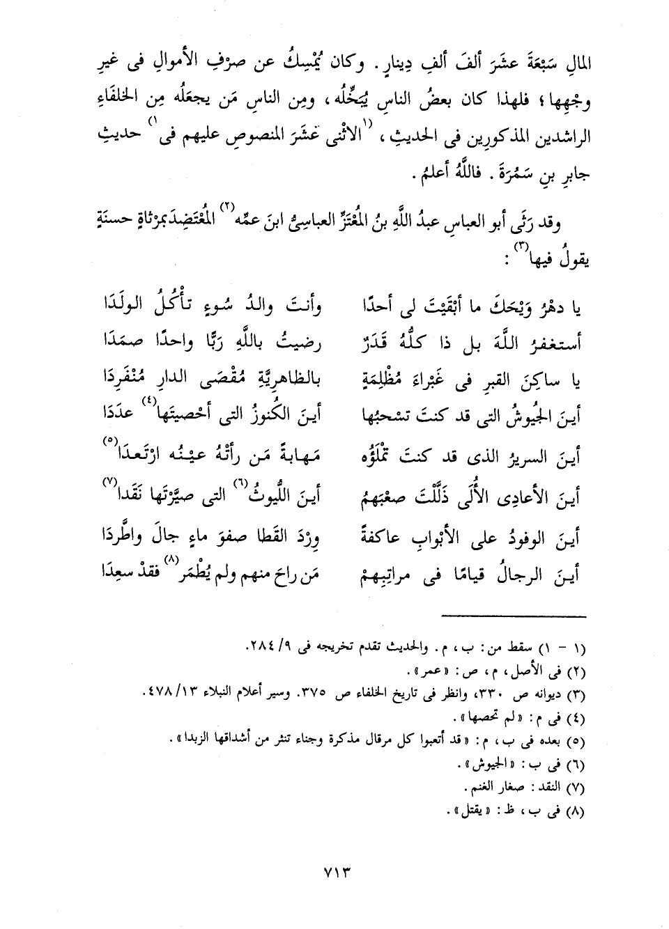 الْمَالِ سَبْعَةَ عَشَرَ أَلْفَ أَلْفِ دِينَارٍ. وَكَانَ يُمْسِكُ عَنْ صَرْفِ الْأَمْوَالِ فِي غَيْرِ وَجْهِهَا، فَلِهَذَا كَانَ بَعْضُ النَّاسِ يُبَخِّلُهُ، وَمِنَ النَّاسِ مَنْ يَجْعَلُهُ مِنَ الْخُلَفَاءِ الرَّاشِدِينَ الْمَذْكُورِينَ فِي الْحَدِيثِ، الِاثْنَيْ عَشَرَ الْمَنْصُوصِ عَلَيْهِمْ فِي حَدِيثِ جَابِرِ بْنِ سَمُرَةَ. فَاللَّهُ أَعْلَمُ.