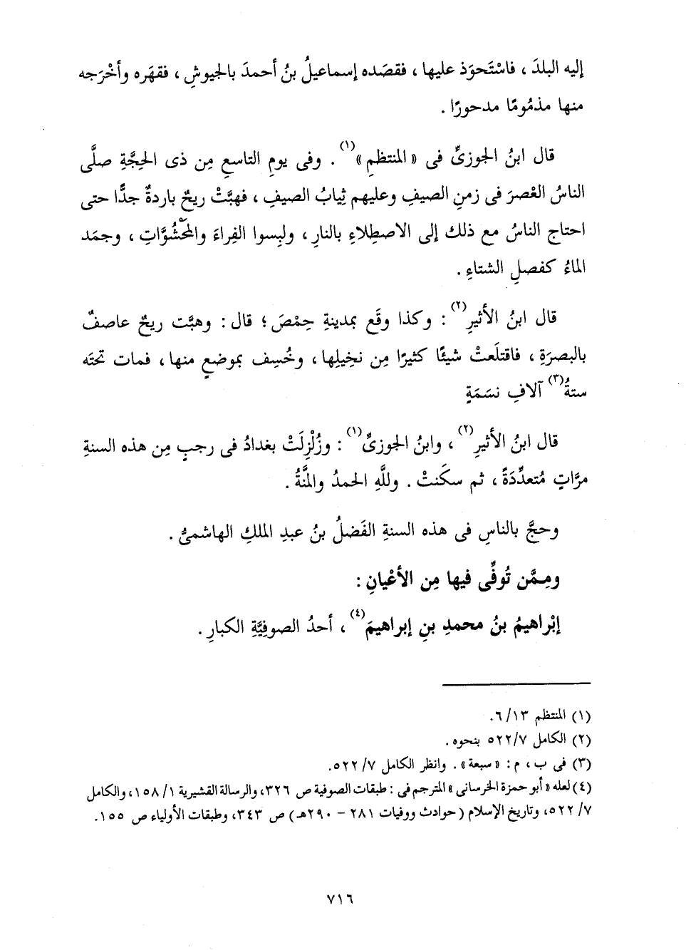 قَالَ ابْنُ الْجَوْزِيِّ فِي " الْمُنْتَظَمِ ": وَفِي يَوْمِ التَّاسِعِ مِنْ ذِي الْحِجَّةِ مِنْهَا صَلَّى النَّاسُ الْعَصْرَ فِي زَمَنِ الصَّيْفِ وَعَلَيْهِمْ ثِيَابُ الصَّيْفِ فَهَبَّتْ رِيحٌ بَارِدَةٌ جِدًّا حَتَّى احْتَاجَ النَّاسُ مَعَ ذَلِكَ إِلَى الِاصْطِلَاءِ بِالنَّارِ وَلَبِسُوا الْفِرَاءَ والْمَحْشُوَّاتِ وَجَمَدَ الْمَاءُ كَفَصْلِ الشِّتَاءِ.