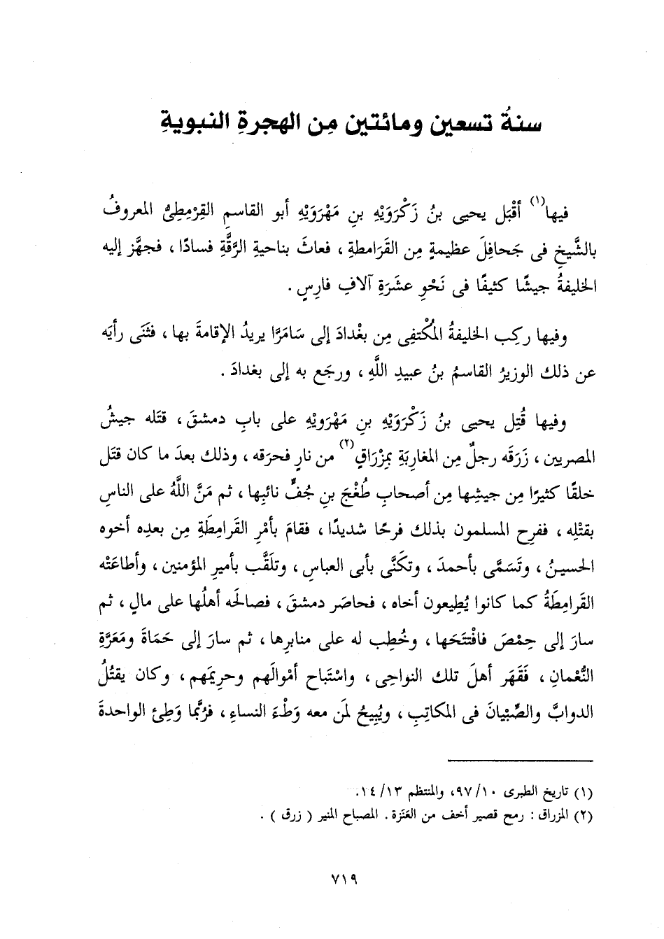 فِيهَا أَقْبَلَ يَحْيَى بْنُ زَكْرَوَيْهِ بْنِ مَهْرَوَيْهِ أَبُو قَاسِمٍ الْقِرْمِطِيُّ الْمَعْرُوفُ بِالشَّيْخِ فِي جَحَافِلَ عَظِيمَةٍ مِنَ الْقَرَامِطَةِ، فَعَاثَ بِنَاحِيَةِ الرَّقَّةِ فَسَادًا فَجَهَّزَ إِلَيْهِ الْخَلِيفَةُ جَيْشًا كَثِيفًا فِي نَحْوِ عَشَرَةِ آلَافِ فَارِسٍ.