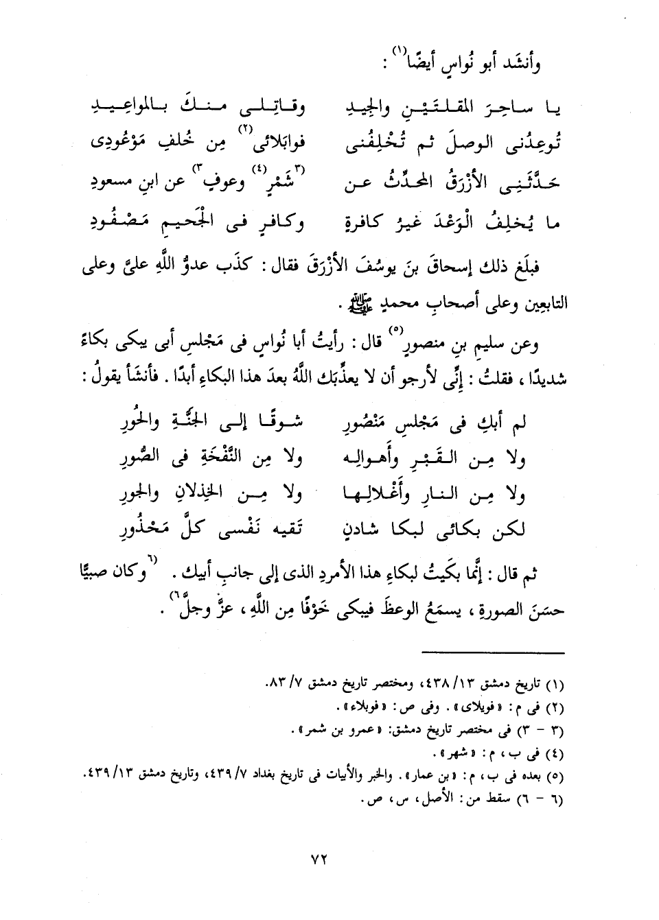 وَعَنْ سُلَيْمِ بْنِ مَنْصُورٍ قَالَ: رَأَيْتُ أَبَا نُوَاسٍ فِي مَجْلِسِ أَبِي يَبْكِي بُكَاءً شَدِيدًا فَقُلْتُ: إِنِّي لَأَرْجُو أَنْ لَا يُعَذِّبَكَ اللَّهُ بَعْدَ هَذَا الْبُكَاءِ أَبَدًا. فَأَنْشَأَ يَقُولُ: