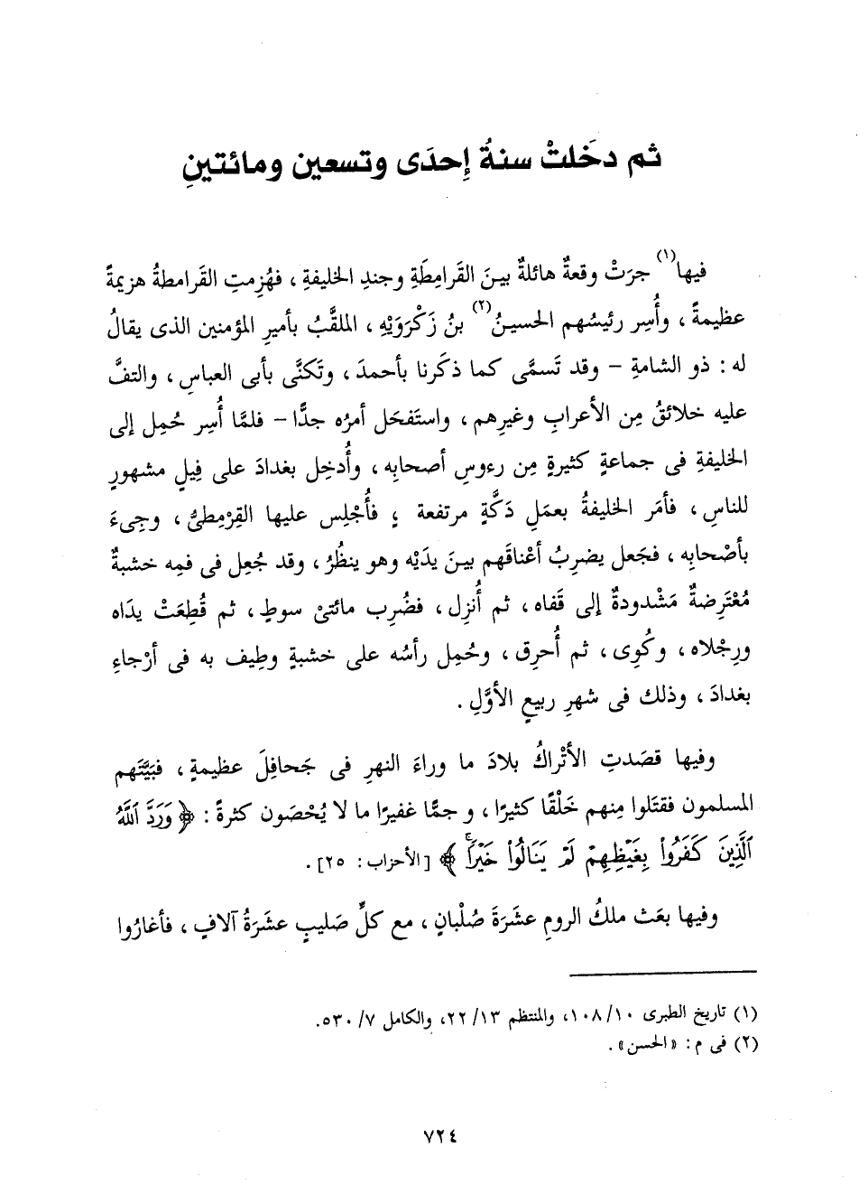 فِي هَذِهِ السَّنَةِ جَرَتْ وَقْعَةٌ هَائِلَةٌ بَيْنَ الْقَرَامِطَةِ وَجُنْدِ الْخَلِيفَةِ فَهُزِمَتِ الْقَرَامِطَةُ هَزِيمَةً عَظِيمَةً، وَأَسِرَ رَئِيسُهُمُ الْحُسَيْنُ بْنُ زَكْرَوَيْهِ، الْمُلَقَّبُ بِأَمِيرِ الْمُؤْمِنِينَ، الَّذِي يُقَالُ لَهُ: ذُو الشَّامَةِ، وَقَدْ تَسَمَّى كَمَا ذَكَرْنَا بِأَحْمَدَ، وَتَكَنَّى بِأَبِي الْعَبَّاسِ، وَالْتَفَّ عَلَيْهِ خَلْقٌ مِنَ الْأَعْرَابِ وَغَيْرِهِمْ، وَاسْتَفْحَلَ أَمْرُهُ جَدَّا، فَلَمَّا أُسِرَ حُمِلَ إِلَى الْخَلِيفَةِ فِي جَمَاعَةٍ كَثِيرَةٍ مِنْ رُءُوسِ أَصْحَابِهِ، أُدْخِلَ بَغْدَادَ عَلَى فِيلٍ مَشْهُورٍ لِلنَّاسِ، فَأَمَرَ الْخَلِيفَةُ بِعَمَلِ دَكَّةٍ مُرْتَفِعَةٍ فَأُجْلِسَ عَلَيْهَا الْقِرْمِطِيُّ، وَجِيءَ بِأَصْحَابِهِ فَجَعَلَ يَضْرِبُ أَعْنَاقَهُمْ بَيْنَ يَدَيْهِ وَهُوَ يَنْظُرُ، وَقَدْ جَعَلَ فِي فَمِهِ خَشَبَةً مُعْتَرِضَةً مَشْدُودَةً إِلَى قَفَاهُ ثُمَّ أُنْزِلَ فَضُرِبَ مِائَتَيْ سَوْطٍ ثُمَّ قُطِعَتْ يَدَاهُ وَرَجْلَاهُ وَكُوِيَ ثُمَّ أُحْرِقَ وَحُمِلَ رَأْسُهُ عَلَى خَشَبَةٍ وَطِيفَ بِهِ فِي أَرْجَاءِ بَغْدَادَ وَذَلِكَ فِي شَهْرِ رَبِيعٍ الْأَوَّلِ.