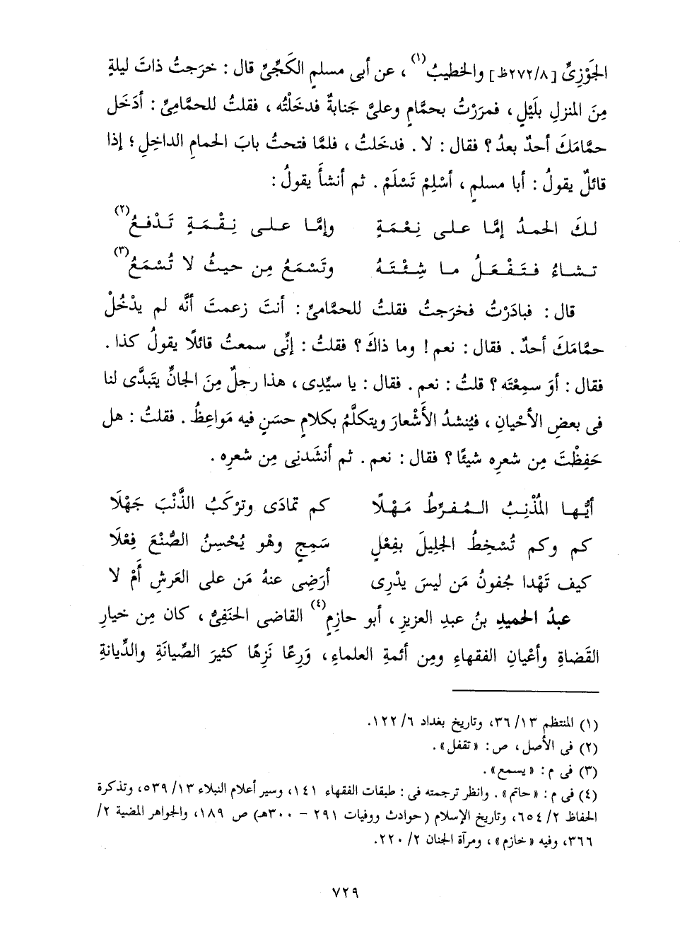قَالَ: خَرَجْتُ ذَاتَ لَيْلَةٍ مِنَ الْمَنْزِلِ بِلَيْلٍ فَمَرَرْتُ بِحَمَّامٍ وَعَلَيَّ جَنَابَةٌ فَدَخَلْتُهُ، فَقُلْتُ لِلْحَمَّامِيِّ: أَدَخَلَ حَمَّامَكَ أَحَدٌ بَعْدُ؟ فَقَالَ: لَا، فَدَخَلْتُ، فَلَمَّا فَتَحْتُ بَابَ الْحَمَّامِ الدَّاخِلَ إِذَا قَائِلٌ يَقُولُ: أَبَا مُسْلِمٍ أَسْلِمْ تَسْلَمْ، ثُمَّ أَنْشَأَ يَقُولُ: