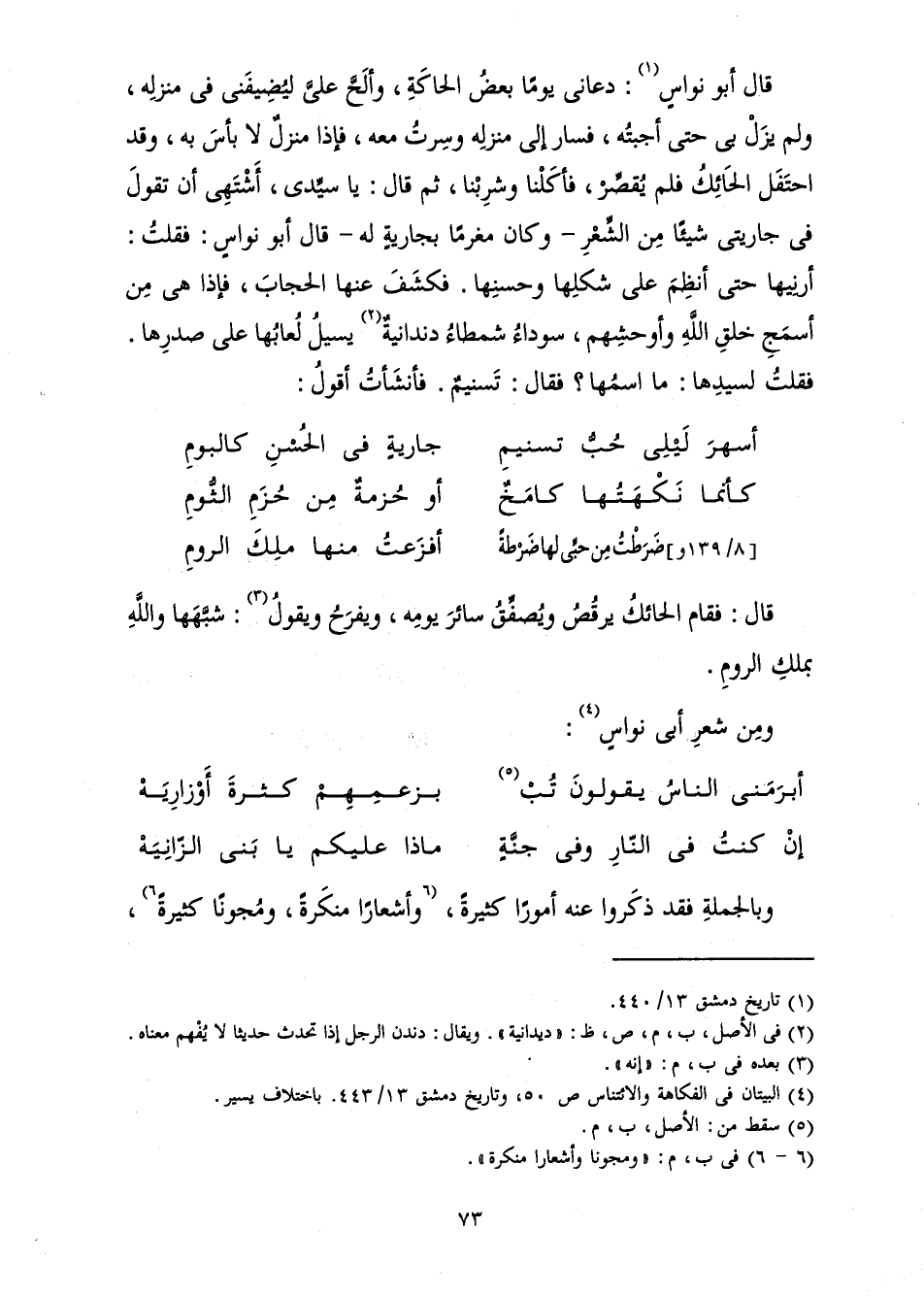 قَالَ أَبُو نُوَاسٍ: دَعَانِي يَوْمًا بَعْضُ الْحَاكَةِ، وَأَلَحَّ عَلِيَّ لِيُضِيفَنِي فِي مَنْزِلِهِ، وَلَمْ يَزَلْ بِي حَتَّى أَجَبْتُهُ، فَسَارَ إِلَى مَنْزِلِهِ وَسِرْتُ مَعَهُ، فَإِذَا مَنْزِلٌ لَا بَأْسَ بِهِ، وَقَدِ احْتَفَلَ الْحَائِكُ فَلَمْ يُقَصِّرْ، فَأَكَلْنَا وَشَرِبْنَا، ثُمَّ قَالَ: يَا سَيِّدِي، أَشْتَهِي أَنْ تَقُولَ فِي جَارِيَتِي شَيْئًا مِنَ الشِّعْرِ وَكَانَ مُغْرَمًا بِجَارِيَةٍ لَهُ. قَالَ أَبُو نُوَاسٍ فَقُلْتُ: أَرِنِيهَا حَتَّى أَنْظِمَ عَلَى شَكْلِهَا، وَحُسْنِهَا. فَكَشَفَ عَنْهَا الْحِجَابَ، فَإِذَا هِيَ مِنْ أَسْمَجِ خَلْقِ اللَّهِ وَأَوْحَشِهِمْ، سَوْدَاءُ شَمْطَاءُ دِنْدَانِيَةٌ يَسِيلُ لُعَابُهَا عَلَى صَدْرِهَا، فَقُلْتُ لِسَيِّدِهَا: مَا اسْمُهَا؟ فَقَالَ: تَسْنِيمُ. فَأَنْشَأْتُ أَقُولُ: