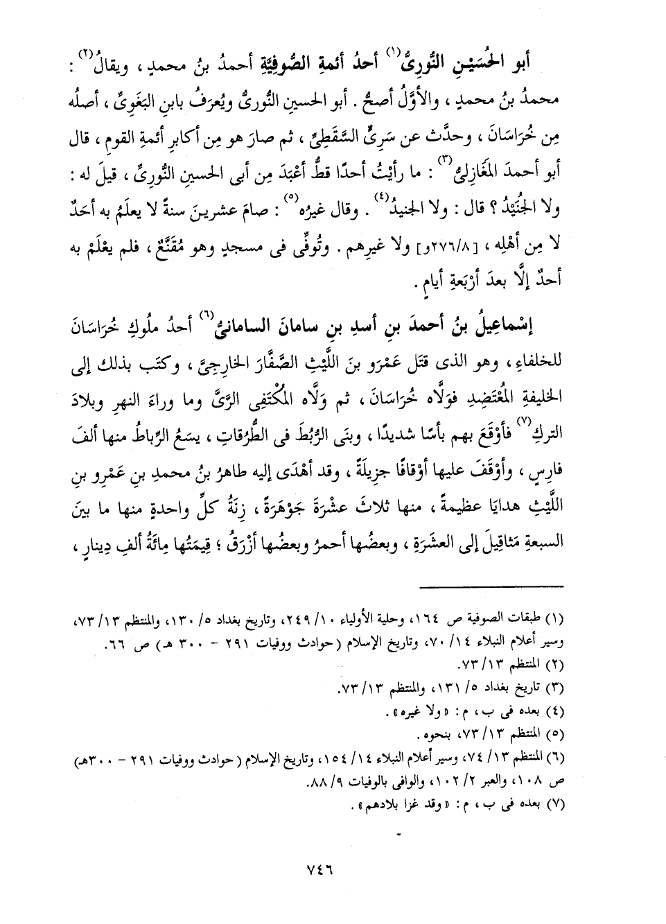 أَحْمَدُ بْنُ مُحَمَّدٍ وَيُقَالُ مُحَمَّدُ بْنُ مُحَمَّدٍ وَالْأَوَّلُ أَصَحُّ، أَبُو الْحُسَيْنِ النُّورِيُّ، وَيُعْرَ فُ بِابْنِ الْبَغَوِيِّ أَصْلُهُ مِنْ خُرَاسَانَ وَحَدَّثَ عَنْ سَرِيٍّ السَّقَطِيِّ ثُمَّ صَارَ هُوَ مِنْ أَكَابِرِ أَئِمَّةِ الْقَوْمِ.