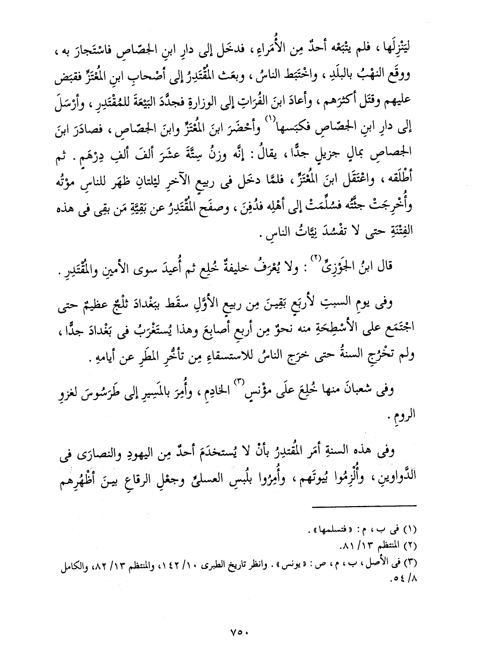 وَفِي هَذِهِ السَّنَةِ أَمَرَ الْمُقْتَدِرُ بِأَنْ لَا يُسْتَخْدَمَ أَحَدٌ مِنَ الْيَهُودِ وَالنَّصَارَى فِي الدَّوَاوِينِ وَأُلْزِمُوا بُيُوتَهُمْ وَأُمِرُوا بِلُبْسِ الْعَسَلِيِّ وَجَعْلِ الرِّقَاعِ بَيْنَ أَظْهُرِهِمْ