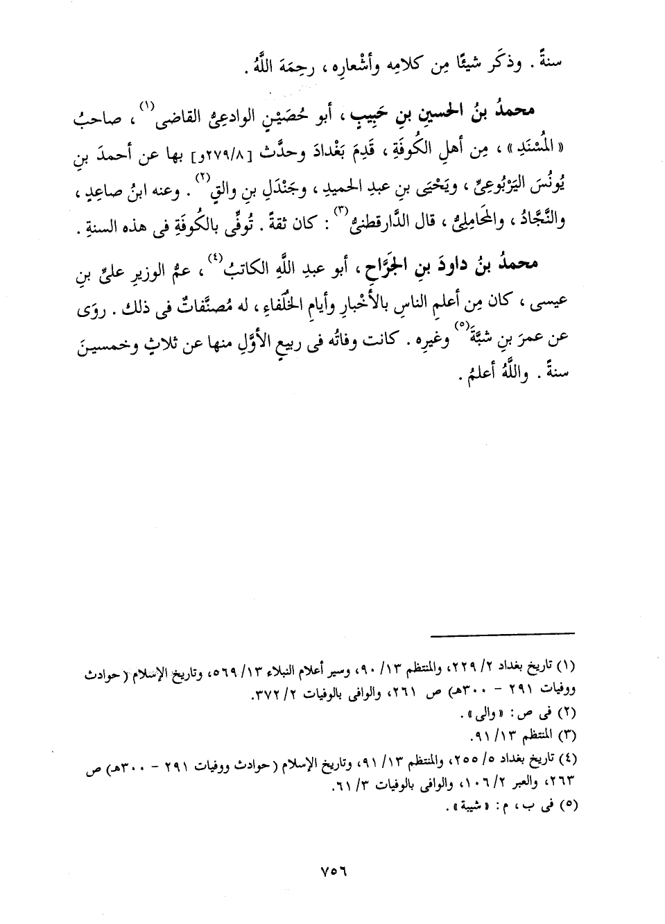 مُحَمَّدُ بْنُ دَاوُدَ بْنِ الْجَرَّاحِ أَبُو عَبْدِ اللَّهِ الْكَاتِبُ عَمُّ الْوَزِيرِ عَلِيِّ بْنِ عِيسَى كَانَ مِنْ أَعْلَمِ النَّاسِ بِالْأَخْبَارِ وَأَيَّامِ الْخُلَفَاءِ، لَهُ مُصَنَّفَاتٌ فِي ذَلِكَ رَوَى عَنْ عُمَرَ بْنِ شَبَّةَ وَغَيْرِهِ. كَانَتْ وَفَاتُهُ فِي رَبِيعٍ الْأَوَّلِ مِنْهَا عَنْ ثَلَاثٍ وَخَمْسِينَ سَنَةً. وَاللَّهُ أَعْلَمُ.