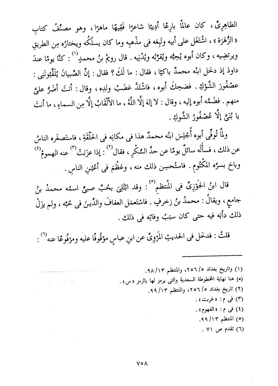 الظَّاهِرِيِّ كَانَ عَالِمًا بَارِعًا أَدِيبًا شَاعِرًا فَقِيهًا مَاهِرًا، وَهُوَ مُصَنِّفُ كِتَابِ " الزُّهَرَةِ " اشْتَغَلَ عَلَى أَبِيهِ وَتَبِعَهُ فِي مَذْهَبِهِ وَمَا كَانَ يَسْلُكُهُ يَخْتَارُهُ مِنَ الطَّرِيقِ وَيَرْتَضِيهِ، وَكَانَ أَبُوهُ يُحِبُّهُ وَيُقَرِّبُهُ وَيُدْنِيهِ.