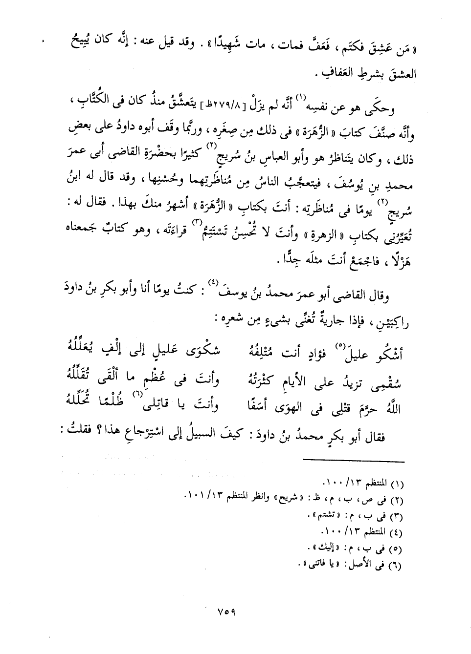 " «مَنْ عَشِقَ فَكَتَمَ فَعَفَّ فَمَاتَ مَاتَ شَهِيدًا» " وَقَدْ قِيلَ عَنْهُ إِنَّهُ كَانَ يُبِيحُ الْعِشْقَ بِشَرْطِ الْعَفَافِ.