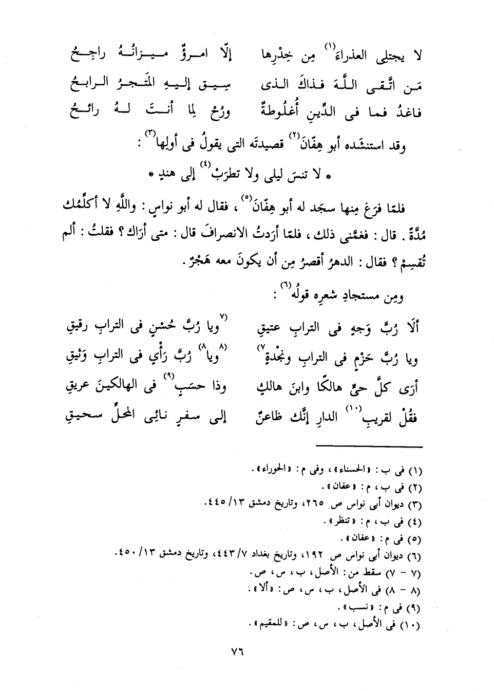 فَلَمَّا فَرَغَ مِنْهَا سَجَدَ لَهُ أَبُو هِفَّانَ، فَقَالَ لَهُ أَبُو نُوَاسٍ: وَاللَّهِ لَا أُكَلِّمُكَ مُدَّةً. قَالَ: فَغَمَّنِي ذَلِكَ، فَلَمَّا أَرَدْتُ الِانْصِرَافَ قَالَ: مَتَى أَرَاكَ؟ فَقُلْتُ: أَلَمْ تُقْسِمْ؟ فَقَالَ: الدَّهْرُ أَقْصَرُ مِنْ أَنْ يَكُونَ مَعَهُ هَجْرٌ.