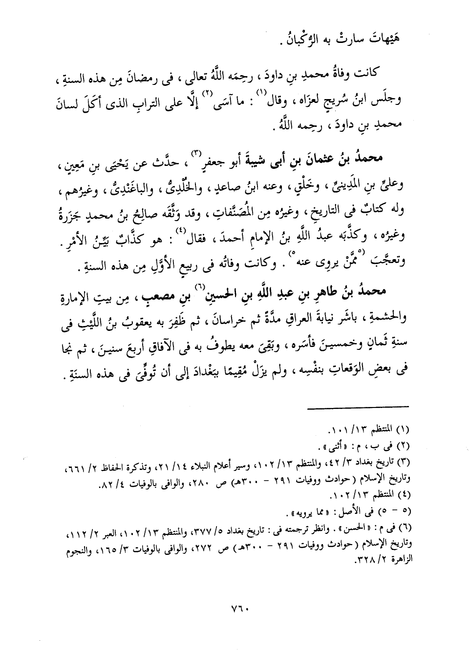 مُحَمَّدُ بْنُ طَاهِرِ بْنِ عَبْدِ اللَّهِ بْنِ الْحُسَيْنِ بْنِ مُصْعَبٍ مِنْ بَيْتِ الْإِمَارَةِ وَالْحِشْمَةِ، بَاشَرَ نِيَابَةَ الْعِرَاقِ مُدَّةً ثُمَّ خُرَاسَانَ ثُمَّ ظَفِرَ بِهِ يَعْقُوبُ بْنُ اللَّيْثِ فِي سَنَةِ ثَمَانٍ وَخَمْسِينَ فَأَسَرَهُ، وَبَقِيَ مَعَهُ يَطُوفُ بِهِ فِي الْآفَاقِ أَرْبَعَ سِنِينَ ثُمَّ نَجَا فِي بَعْضِ الْوَقَعَاتِ بِنَفْسِهِ، وَلَمْ يَزَلْ مُقِيمًا بِبَغْدَادَ إِلَى أَنْ تُوُفِّيَ فِي هَذِهِ السَّنَةِ.