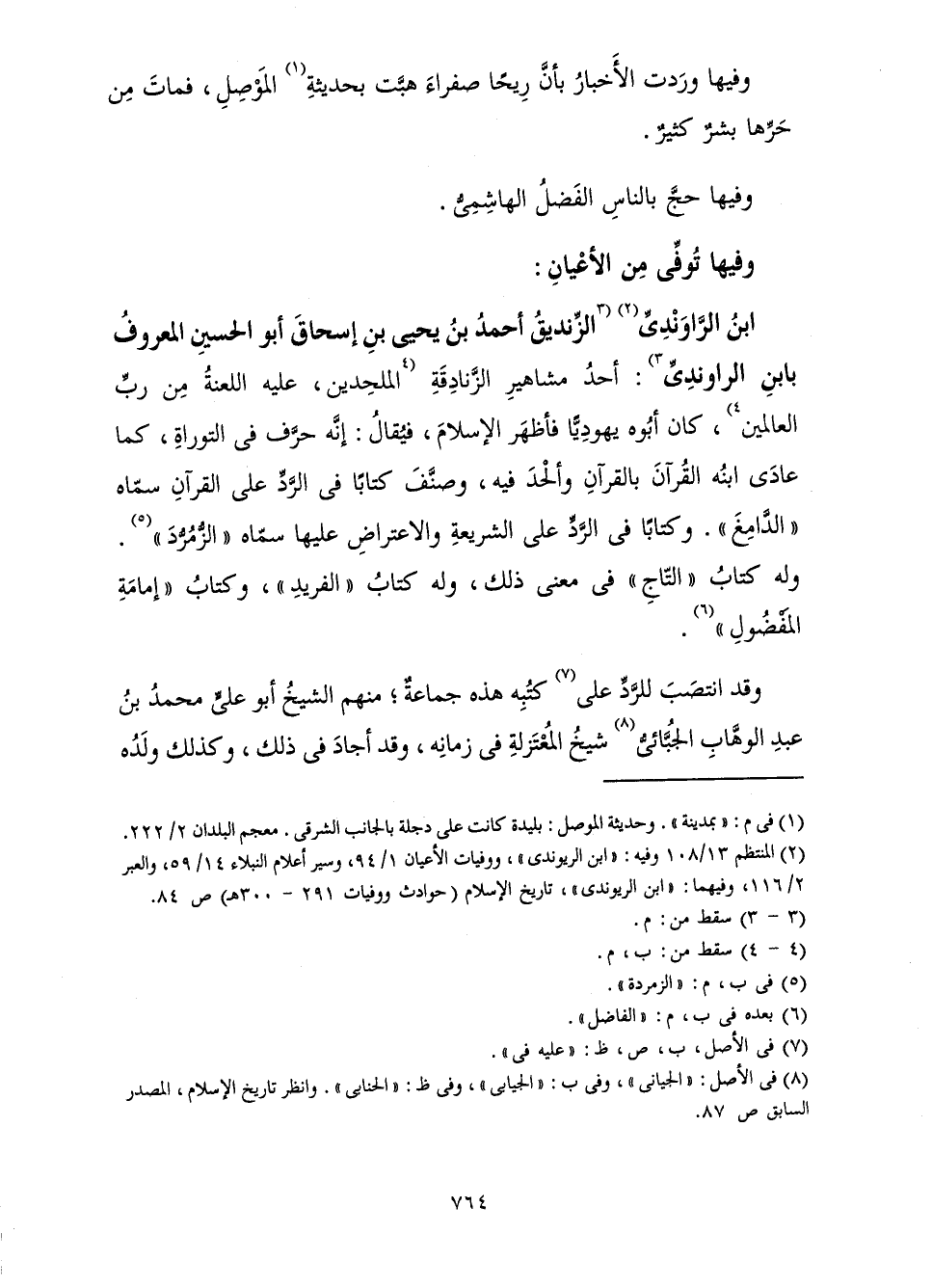 الزِّنْدِيقُ أَحْمَدُ بْنُ يَحْيَى بْنِ إِسْحَاقَ أَبُو الْحُسَيْنِ الْمَعْرُوفُ بِابْنِ الرَّاوَنْدِيِّ، أَحَدُ مَشَاهِيرِ الزَّنَادِقَةِ الْمُلْحِدِينَ - عَلَيْهِ اللَّعْنَةُ مِنْ رَبِّ الْعَالَمِينَ - كَانَ أَبُوهُ يَهُودِيًّا فَأَظْهَرَ الْإِسْلَامَ، فَيُقَالُ: إِنَّهُ حَرَّفَ فِي التَّوْرَاةِ كَمَا عَادَى ابْنُهُ الْقُرْآنَ بِالْقُرْآنِ وَأَلْحَدَ فِيهِ، وَصَنَّفَ كِتَابًا فِي الرَّدِّ عَلَى الْقُرْآنِ سَمَّاهُ " الدَّامِغَ " وَكِتَابًا فِي الرَّدِّ عَلَى الشَّرِيعَةِ وَالِاعْتِرَاضِ عَلَيْهَا سَمَّاهُ " الزُّمُرُّدَ " وَلَهُ كِتَابُ " التَّاجِ " فِي مَعْنَى ذَلِكَ وَلَهُ كِتَابُ " الْفَرِيدِ " وَكِتَابُ " إِمَامَةِ الْمَفْضُولِ ".