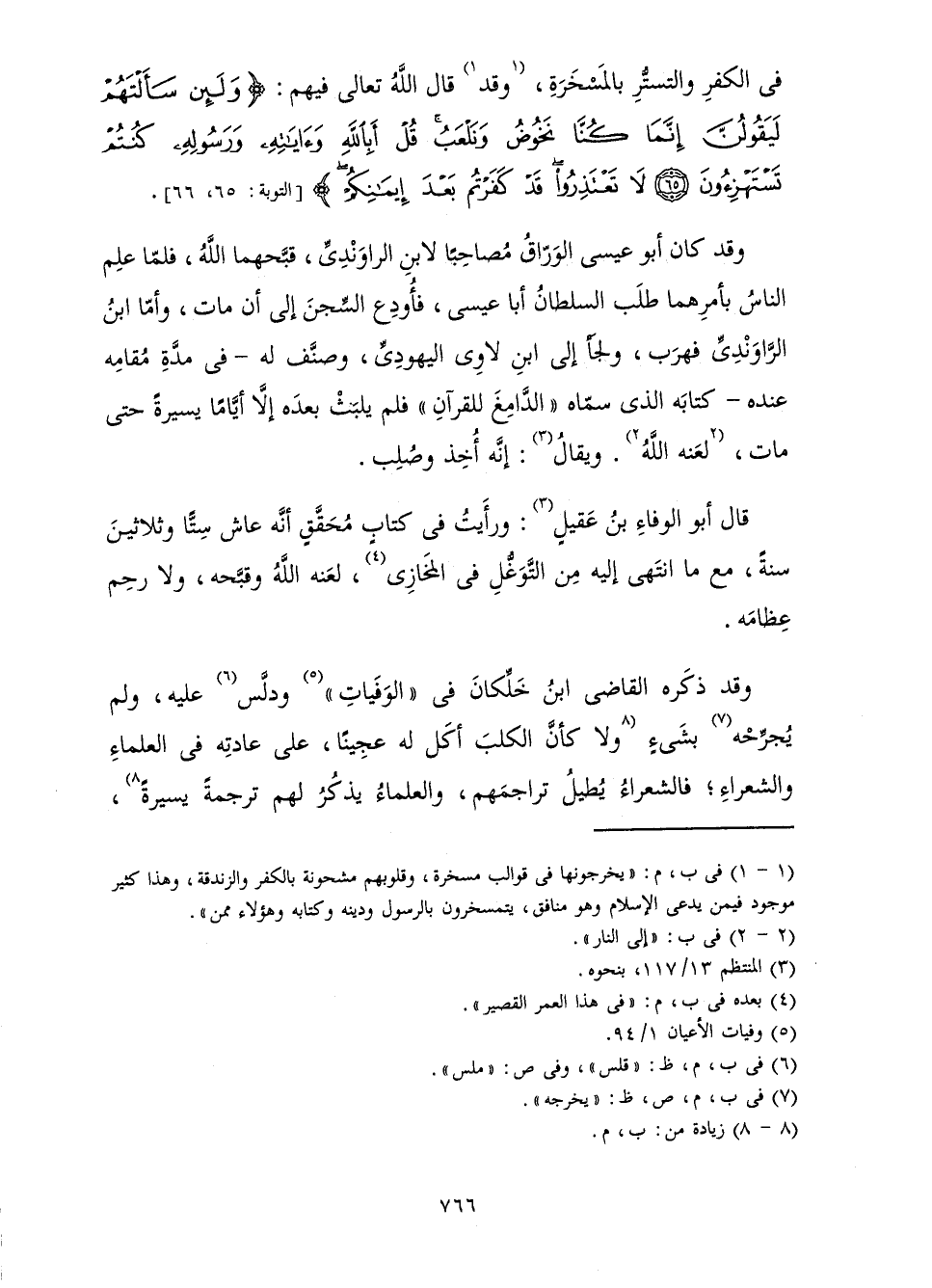 وَقَدْ كَانَ أَبُو عِيسَى الْوَرَّاقُ مُصَاحِبًا لِابْنِ الرَّاوَنْدِيِّ - قَبَّحَهُمَا اللَّهُ - فَلَمَّا عَلِمَ النَّاسُ بِأَمْرِهِمَا طَلَبَ السُّلْطَانُ أَبَا عِيسَى، فَأُودِعَ السِّجْنَ إِلَى أَنْ مَاتَ، وَأَمَّا ابْنُ الرَّاوَنْدِيِّ فَهَرَبَ وَلَجَأَ إِلَى ابْنِ لَاوِي الْيَهُودِيِّ وَصَنَّفَ لَهُ فِي مُدَّةِ مُقَامِهِ عَنْهُ كِتَابَهُ الَّذِي سَمَّاهُ " الدَّامِغَ لِلْقُرْآنِ " فَلَمْ يَلْبَثْ بَعْدَهُ إِلَّا أَيَّامًا يَسِيرَةً حَتَّى مَاتَ لَعَنَهُ اللَّهُ، وَيُقَالُ: إِنَّهُ أُخِذَ وَصُلِبَ.