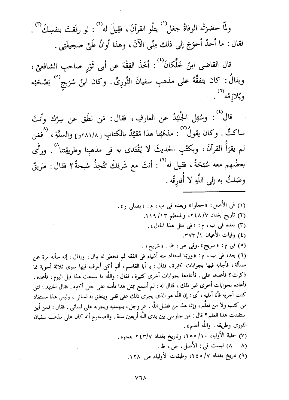 قَالَ: وَسُئِلَ الْجُنَيْدُ عَنِ الْعَارِفِ، فَقَالَ: مِنْ نَطَقَ عَنْ سِرِّكَ وَأَنْتَ سَاكِتٌ وَكَانَ يَقُولُ: مَذْهَبُنَا هَذَا مُقَيَّدٌ بِالْكِتَابِ وَالسُّنَّةِ فَمَنْ لَمْ يَقْرَأِ الْقُرْآنَ وَيَكْتُبِ الْحَدِيثَ لَا يُقْتَدَى بِهِ فِي مَذْهَبِنَا وَطَرِيقَتِنَا. وَرَأَى بَعْضُهُمْ مَعَهُ سُبْحَةً، فَقَالَ لَهُ: أَنْتَ مَعَ شَرَفِكَ تَتَّخِذُ سُبْحَةً؟ فَقَالَ: طَرِيقٌ وَصَلْتُ بِهِ إِلَى اللَّهِ لَا أُفَارِقُهُ.
