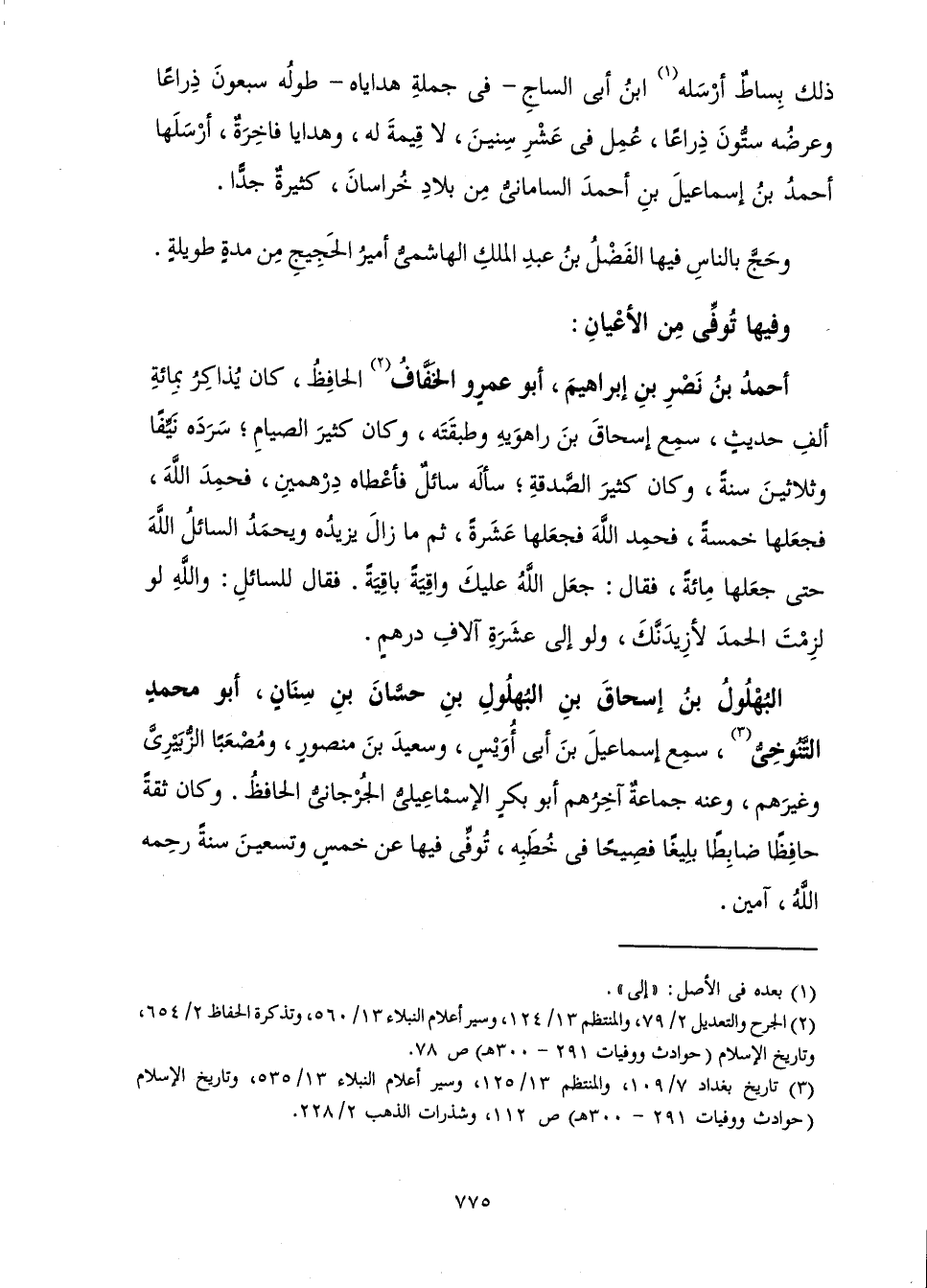 ابْنِ حَسَّانَ بْنِ سِنَانٍ أَبُو مُحَمَّدٍ التَّنُوخِيُّ سَمِعَ إِسْمَاعِيلَ بْنَ أَبِي أُوَيْسٍ وَسَعِيدَ بْنَ مَنْصُورٍ وَمُصْعَبًا الزُّبَيْرِيَّ وَغَيْرَهُمْ وَعَنْهُ جَمَاعَةٌ آخِرُهُمْ أَبُو بَكْرٍ الْإِسْمَاعِيلِيُّ الْجُرْجَانِيُّ الْحَافِظُ وَكَانَ ثِقَةً حَافِظًا ضَابِطًا بَلِيغًا فَصِيحًا فِي خُطَبِهِ تُوُفِّيَ فِيهَا عَنْ خَمْسٍ وَتِسْعِينَ سَنَةً، رَحِمَهُ اللَّهُ. آمِينَ.