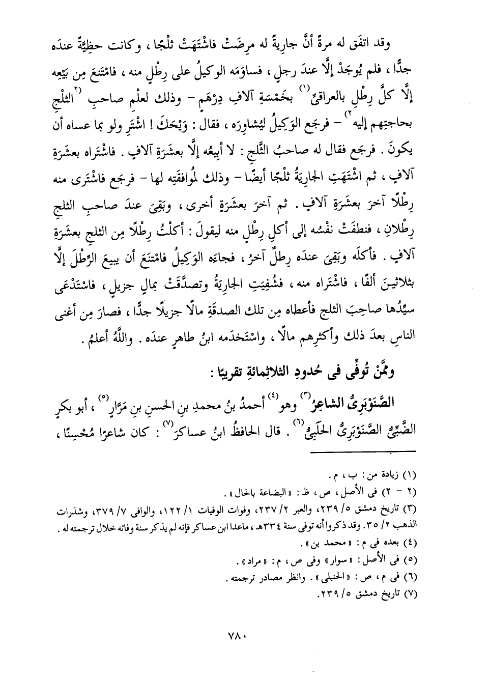 وَاتَّفَقَ لَهُ مَرَّةً أَنَّ جَارِيَةً لَهُ مَرِضَتْ فَاشْتَهَتْ ثَلْجًا وَكَانَ حَظِيَّةً عِنْدَهُ جِدًّا فَلَمْ يُوجَدْ إِلَّا عِنْدَ رَجُلٍ، فَسَاوَمَهُ الْوَكِيلُ عَلَى رِطْلٍ مِنْهُ فَامْتَنَعَ مِنْ بَيْعِهِ إِلَّا كُلُّ رِطْلٍ بِالْعِرَاقِيِّ بِخَمْسَةِ آلَافِ دِرْهَمٍ وَذَلِكَ لِعِلْمِ صَاحِبِ الثَّلْجِ بِحَاجَتِهِمْ إِلَيْهِ فَرَجَعَ الْوَكِيلُ لِيُشَاوِرَهُ، فَقَالَ: وَيْحَكَ اشْتَرِ وَلَوْ بِمَا عَسَاهُ أَنْ يَكُونَ، فَرَجَعَ فَقَالَ لَهُ صَاحِبُ الثَّلْجِ: لَا أَبِيعُهُ إِلَّا بِعَشَرَةِ آلَافٍ، فَاشْتَرَاهُ بِعَشَرَةِ آلَافٍ ثُمَّ اشْتَهَتِ الْجَارِيَةُ ثَلْجًا أَيْضًا - وَذَلِكَ لِمُوَافَقَتِهِ لَهَا - فَرَجَعَ فَاشْتَرِي مِنْهُ رِطْلًا آخَرَ بِعَشَرَةِ آلَافٍ ثُمَّ آخَرَ بِعَشَرَةٍ أُخْرَى، وَبَقِيَ عِنْدَ صَاحِبِ الثَّلْجِ رِطْلَانِ فَنَطَفَتْ نَفْسُهُ إِلَى أَكْلِ رِطْلٍ مِنْهُ لِيَقُولَ أَكَلْتُ رِطْلًا مِنَ الثَّلْجِ بِعَشَرَةِ آلَافٍ، فَأَكَلَهُ وَبَقِيَ عِنْدَهُ رِطْلٌ، فَجَاءَهُ الْوَكِيلُ فَامْتَنَعَ أَنْ يَبِيعَهُ الرِّطْلَ إِلَّا بِثَلَاثِينَ أَلْفًا فَاشْتَرَاهُ مِنْهُ، فَشُفِيَتِ الْجَارِيَةُ وَتَصَدَّقَتْ بِمَالٍ جَزِيلٍ فَاسْتَدْعَى سَيِّدُهَا صَاحِبَ الثَّلْجِ فَأَعْطَاهُ مِنْ تِلْكَ الصَّدَقَةِ مَالًا جَزِيلًا جِدًّا، فَصَارَ مِنْ أَغْنَى النَّاسِ بَعْدَ ذَلِكَ وَأَكْثَرِهِمْ مَالًا، وَاسْتَخْدَمَهُ ابْنُ طَاهِرٍ عِنْدَهُ، وَاللَّهُ أَعْلَمُ.