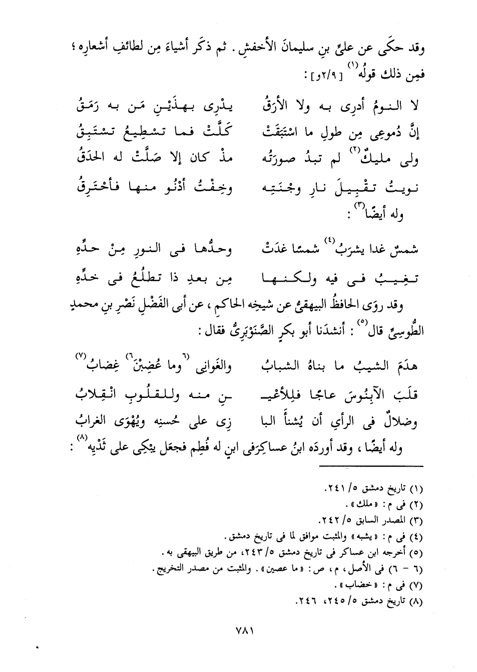 وَقَدْ حَكَى عَنْ عَلِيِّ بْنِ سُلَيْمَانَ الْأَخْفَشِ، ثُمَّ ذَكَرَ أَشْيَاءَ مِنْ لَطَائِفِ أَشْعَارِهِ، فَمِنْ ذَلِكَ قَوْلُهُ:
