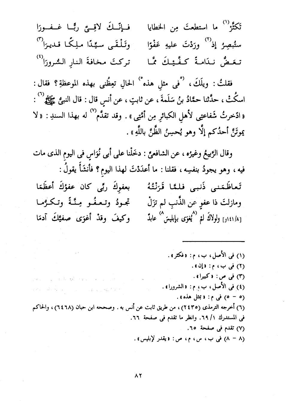 فَقُلْتُ: وَيْلَكَ، فِي مِثْلِ هَذِهِ الْحَالِ تَعِظُنِي بِهَذِهِ الْمَوْعِظَةِ؟ فَقَالَ: اسْكُتْ، حَدَّثَنَا حَمَّادُ بْنُ سَلَمَةَ عَنْ ثَابِتٍ، عَنْ أَنَسٍ قَالَ: قَالَ النَّبِيُّ صَلَّى اللَّهُ عَلَيْهِ وَسَلَّمَ: «ادَّخَرْتُ شَفَاعَتِي لِأَهْلِ الْكَبَائِرِ مِنْ أُمَّتِي» وَقَدْ تَقَدَّمَ لَهُ بِهَذَا السَّنَدِ «لَا يَمُوتَنَّ أَحَدُكُمْ إِلَّا وَهُوَ يُحْسِنُ الظَّنَّ بِاللَّهِ»