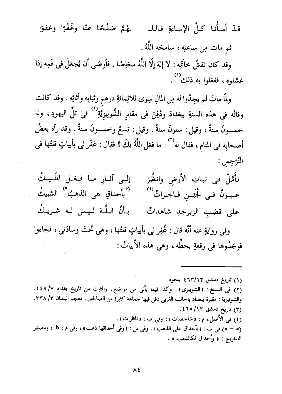 وَفِي رِوَايَةٍ عَنْهُ أَنَّهُ قَالَ: غَفَرَ لِي بِأَبْيَاتٍ قُلْتُهَا، وَهِيَ تَحْتَ وِسَادَتِي، فَجَاءُوا فَوَجَدُوهَا فِي رُقْعَةٍ بِخَطِّهِ وَهِيَ هَذِهِ الْأَبْيَاتُ:
