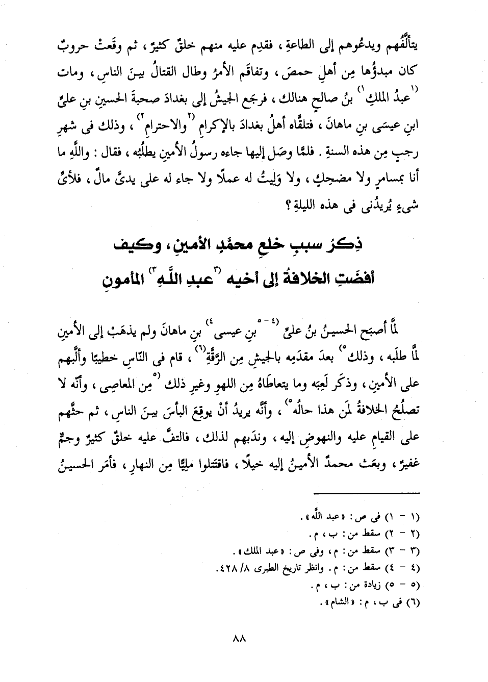 يَتَأَلَّفُهُمْ وَيَدْعُوهُمْ إِلَى الطَّاعَةِ، فَقَدِمَ عَلَيْهِ مِنْهُمْ خَلْقٌ كَثِيرٌ، ثُمَّ وَقَعَتْ حُرُوبٌ كَانَ مَبْدَؤُهَا مِنْ أَهْلِ حِمْصَ وَتَفَاقَمَ الْأَمْرُ وَطَالَ الْقِتَالُ بَيْنَ النَّاسِ، وَمَاتَ عَبْدُ الْمَلِكِ بْنُ صَالِحٍ هُنَالِكَ، فَرَجَعَ الْجَيْشُ إِلَى بَغْدَادَ صُحْبَةَ الْحُسَيْنِ بْنِ عَلِيِّ بْنِ عِيسَى بْنِ مَاهَانَ، فَتَلَقَّاهُ أَهْلُ بَغْدَادَ بِالْإِكْرَامِ وَالِاحْتِرَامِ، وَذَلِكَ فِي شَهْرِ رَجَبٍ مِنْ هَذِهِ السَّنَةِ. فَلَمَّا وَصَلَ إِلَيْهَا جَاءَهُ رَسُولُ الْأَمِينِ يَطْلُبُهُ، فَقَالَ: وَاللَّهِ مَا أَنَا بِمُسَامِرٍ وَلَا مُضْحِكٍ، وَلَا وَلِيتُ لَهُ عَمَلًا وَلَا جَاءَ لَهُ عَلَى يَدَيَّ مَالٌ، فَلِأَيِّ شَيْءٍ يُرِيدُنِي فِي هَذِهِ اللَّيْلَةِ؟