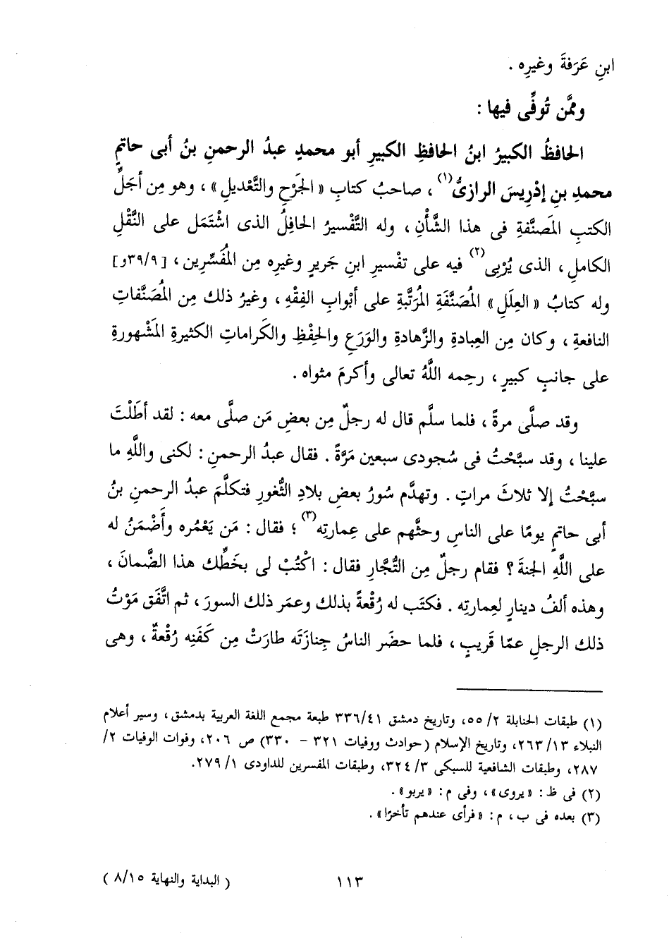 صَاحِبُ كِتَابِ " الْجَرْحِ وَالتَّعْدِيلِ " وَهُوَ مِنْ أَجَلِّ الْكُتُبِ الْمُصَنَّفَةِ فِي هَذَا الشَّأْنِ، وَلَهُ التَّفْسِيرُ الْحَافِلُ الَّذِي اشْتَمَلَ عَلَى النَّقْلِ الْكَامِلِ، الَّذِي يُرْبِي فِيهِ عَلَى تَفْسِيرِ ابْنِ جَرِيرٍ وَغَيْرِهِ مِنَ الْمُفَسِّرِينَ، وَلَهُ كِتَابُ " الْعِلَلِ " الْمُصَنَّفَةِ الْمُرَتَّبَةِ عَلَى أَبْوَابِ الْفِقْهِ، وَغَيْرُ ذَلِكَ مِنَ الْمُصَنَّفَاتِ النَّافِعَةِ، وَكَانَ مِنَ الْعِبَادَةِ وَالزَّهَادَةِ وَالْوَرَعِ وَالْحِفْظِ وَالْكَرَامَاتِ الْكَثِيرَةِ الْمَشْهُورَةِ عَلَى جَانِبٍ كَبِيرٍ، رَحِمَهُ اللَّهُ تَعَالَى، وَأَكْرَمَ مَثْوَاهُ.