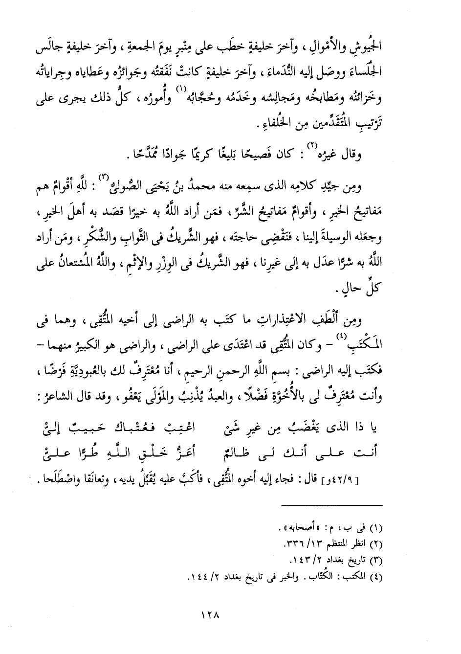 وَمِنْ أَلْطَفِ الِاعْتِذَارَاتِ مَا كَتَبَ بِهِ الرَّاضِي إِلَى أَخِيهِ الْمُتَّقِي، وَهُمَا فِي الْمَكْتَبِ - وَكَانَ الْمُتَّقِي قَدِ اعْتَدَى عَلَى الرَّاضِي، وَالرَّاضِي هُوَ الْكَبِيرُ مِنْهُمَا - فَكَتَبَ إِلَيْهِ الرَّاضِي: بِسْمِ اللَّهِ الرَّحْمَنِ الرَّحِيمِ، أَنَا مُعْتَرِفٌ لَكَ بِالْعُبُودِيَّةِ فَرْضًا، وَأَنْتَ مُعْتَرِفٌ لِي بِالْأُخُوَّةِ فَضْلًا، وَالْعَبْدُ يُذْنِبُ وَالْمَوْلَى يَعْفُو، وَقَدْ قَالَ الشَّاعِرَ: