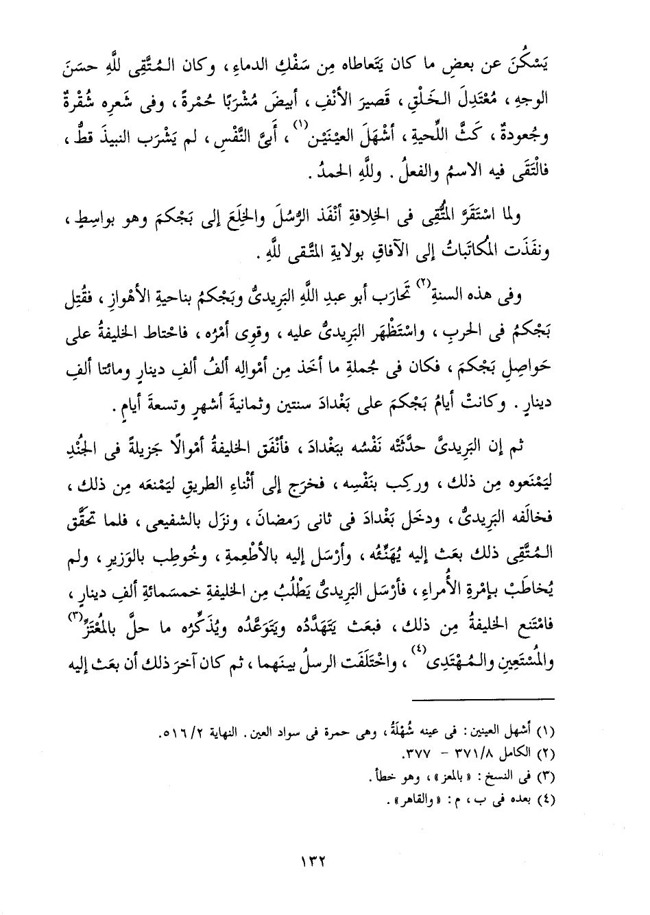 يَسْكُنَ عَنْ بَعْضِ مَا كَانَ يَتَعَاطَاهُ مِنْ سَفْكِ الدِّمَاءِ، وَكَانَ الْمُتَّقِي لِلَّهِ حَسَنَ الْوَجْهِ، مُعْتَدِلَ الْخُلُقِ، قَصِيرَ الْأَنْفِ، أَبْيَضَ مُشْرَبًا حُمْرَةً، وَفِي شِعْرِهِ شُقْرَةٌ وَجُعُودَةٌ، كَثُّ اللِّحْيَةِ، أَشْهَلُ الْعَيْنَيْنِ، أَبِيُّ النَّفْسِ، لَمْ يَشْرَبِ النَّبِيذَ قَطُّ، فَالْتَقَى فِيهِ الِاسْمُ وَالْفِعْلُ. وَلِلَّهِ الْحَمْدُ.