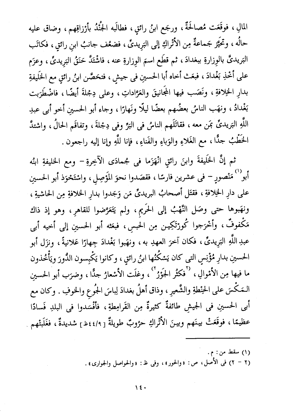 الْمَالِ، فَوَقَعَتْ مُصَالَحَةٌ، وَرَجَعَ ابْنُ رَائِقٍ فَطَالَبَهُ الْجُنْدُ بِأَرْزَاقِهِمْ، وَضَاقَ عَلَيْهِ حَالُهُ، وَتَحَيَّزَ جَمَاعَةٌ مِنَ الْأَتْرَاكِ إِلَى الْبَرِيدِيِّ، فَضَعُفَ جَانِبُ ابْنِ رَائِقٍ فَكَاتَبَ الْبَرِيدِيَّ بِالْوِزَارَةِ بِبَغْدَادَ، ثُمَّ قَطَعَ اسْمَ الْوِزَارَةِ عَنْهُ، فَاشْتَدَّ حَنَقُ الْبَرِيدِيِّ، وَعَزَمَ عَلَى أَخْذِ بَغْدَادَ فَبَعَثَ أَخَاهُ أَبَا الْحُسَيْنِ فِي جَيْشٍ، فَتَحَصَّنَ ابْنُ رَائِقٍ مَعَ الْخَلِيفَةِ بِدَارِ الْخِلَافَةِ، وَنَصَبَ فِيهَا الْمَجَانِيقَ وَالْعَرَّادَاتِ، وَعَلَى دِجْلَةَ أَيْضًا، فَاضْطَرَبَتْ بَغْدَادُ وَنَهَبَ النَّاسُ بَعْضُهُمْ بَعْضًا لَيْلًا وَنَهَارًا، وَجَاءَ أَبُو الْحُسَيْنِ أَخُو أَبِي عَبْدِ اللَّهِ الْبَرِيدِيِّ بِمَنْ مَعَهُ، فَقَاتَلَهُمُ النَّاسُ فِي الْبَرِّ وَفِي دِجْلَةَ، وَتَفَاقَمَ الْحَالُ، وَاشْتَدَّ الْخَطْبُ جِدًّا، مَعَ الْغَلَاءِ وَالْوَبَاءِ وَالْفِنَاءِ، فَإِنَّا لِلَّهِ وَإِنَّا إِلَيْهِ رَاجِعُونَ.