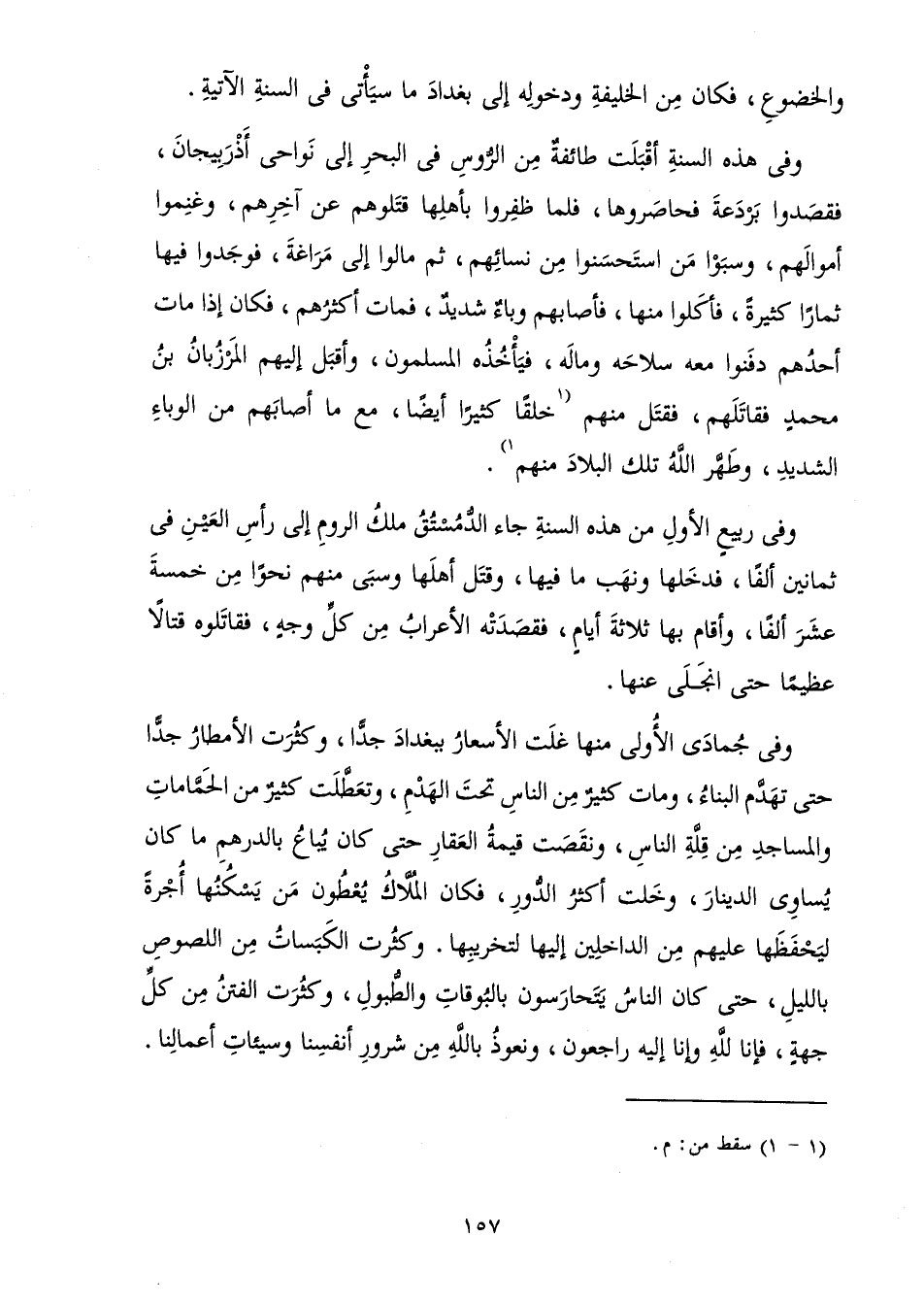 وَفِي جُمَادَى الْأُولَى مِنْهَا غَلَتِ الْأَسْعَارُ بِبَغْدَادَ جِدًّا، وَكَثُرَتِ الْأَمْطَارُ جِدًّا حَتَّى تَهَدَّمَ الْبِنَاءُ، وَمَاتَ كَثِيرٌ مِنَ النَّاسِ تَحْتَ الْهَدْمِ، وَتَعَطَّلَتْ كَثِيرٌ مِنَ الْحَمَّامَاتِ وَالْمَسَاجِدِ مِنْ قِلَّةِ النَّاسِ، وَنَقَصَتْ قِيمَةُ الْعَقَارِ حَتَّى كَانَ يُبَاعُ بِالدِّرْهَمِ مَا كَانَ يُسَاوِي الدِّينَارَ، وَخَلَتْ أَكْثَرُ الدُّورِ، فَكَانَ الْمُلَّاكُ يُعْطُونَ مَنْ يَسْكُنُهَا أُجْرَةً لِيَحْفَظَهَا عَلَيْهِمْ مِنَ الدَّاخِلِينَ إِلَيْهَا لِتَخْرِيبِهَا. وَكَثُرَتِ الْكَبَسَاتُ مِنَ اللُّصُوصِ بِاللَّيْلِ، حَتَّى كَانَ النَّاسُ يَتَحَارَسُونَ بِالْبُوقَاتِ وَالطُّبُولِ، وَكَثُرَتِ الْفِتَنُ مِنْ كُلِّ جِهَةٍ، فَإِنَّا لِلَّهِ وَإِنَّا إِلَيْهِ رَاجِعُونَ، وَنَعُوذُ بِاللَّهِ مِنْ شُرُورِ أَنْفُسِنَا وَسَيِّئَاتِ أَعْمَالِنَا.