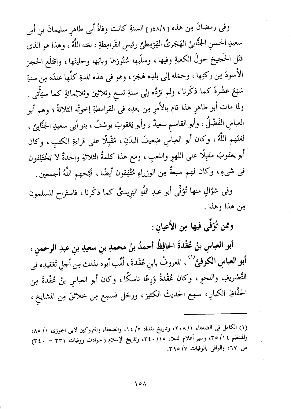 وَفِي رَمَضَانَ مِنْ هَذِهِ السَّنَةِ كَانَتْ وَفَاةُ أَبِي طَاهِرٍ سُلَيْمَانَ بْنِ أَبِي سَعِيدٍ الْحَسَنِ الْجَنَّابِيِّ الْهَجَرِيِّ الْقِرْمِطِيِّ رَئِيسِ الْقَرَامِطَةِ، لَعَنَهُ اللَّهُ، وَهَذَا هُوَ الَّذِي قَتَلَ الْحَجِيجَ حَوْلَ الْكَعْبَةِ وَفِيهَا، وَسَلَبَهَا سُتُورَهَا وَبَابَهَا وَحِلْيَتَهَا، وَاقْتَلَعَ الْحَجَرَ الْأَسْوَدَ مِنْ رُكْنِهَا، وَحَمَلَهُ إِلَى بَلَدِهِ هَجَرَ وَهُوَ فِي هَذِهِ الْمُدَّةِ كُلِّهَا عِنْدَهُ مِنْ سَنَةِ سَبْعَ عَشْرَةَ كَمَا ذَكَرْنَا، وَلَمْ يَرُدَّهُ إِلَى سَنَةِ تِسْعٍ وَثَلَاثِينَ وَثَلَاثِمِائَةٍ كَمَا سَيَأْتِي. وَلَمَّا مَاتَ أَبُو طَاهِرٍ هَذَا قَامَ بِالْأَمْرِ مِنْ بَعْدِهِ فِي الْقَرَامِطَةِ إِخْوَتُهُ الثَّلَاثَةُ ; وَهُمْ أَبُو الْعَبَّاسِ الْفَضْلُ، وَأَبُو الْقَاسِمِ سَعِيدٌ، وَأَبُو يَعْقُوبَ يُوسُفُ، بَنُو أَبِي سَعِيدٍ الْجَنَّابِيِّ، لَعَنَهُمُ اللَّهُ، وَكَانَ أَبُو الْعَبَّاسِ ضَعِيفَ الْبَدَنِ، مُقْبِلًا عَلَى قِرَاءَةِ الْكُتُبِ، وَكَانَ أَبُو يَعْقُوبَ مُقْبِلًا عَلَى اللَّهْوِ وَاللَّعِبِ، وَمَعَ هَذَا كَلِمَةُ الثَّلَاثَةِ وَاحِدَةٌ لَا يَخْتَلِفُونَ فِي شَيْءٍ، وَكَانَ لَهُمْ سَبْعَةٌ مِنَ الْوُزَرَاءِ مُتَّفِقُونَ أَيْضًا، قَبَّحَهُمُ اللَّهُ أَجْمَعِينَ.