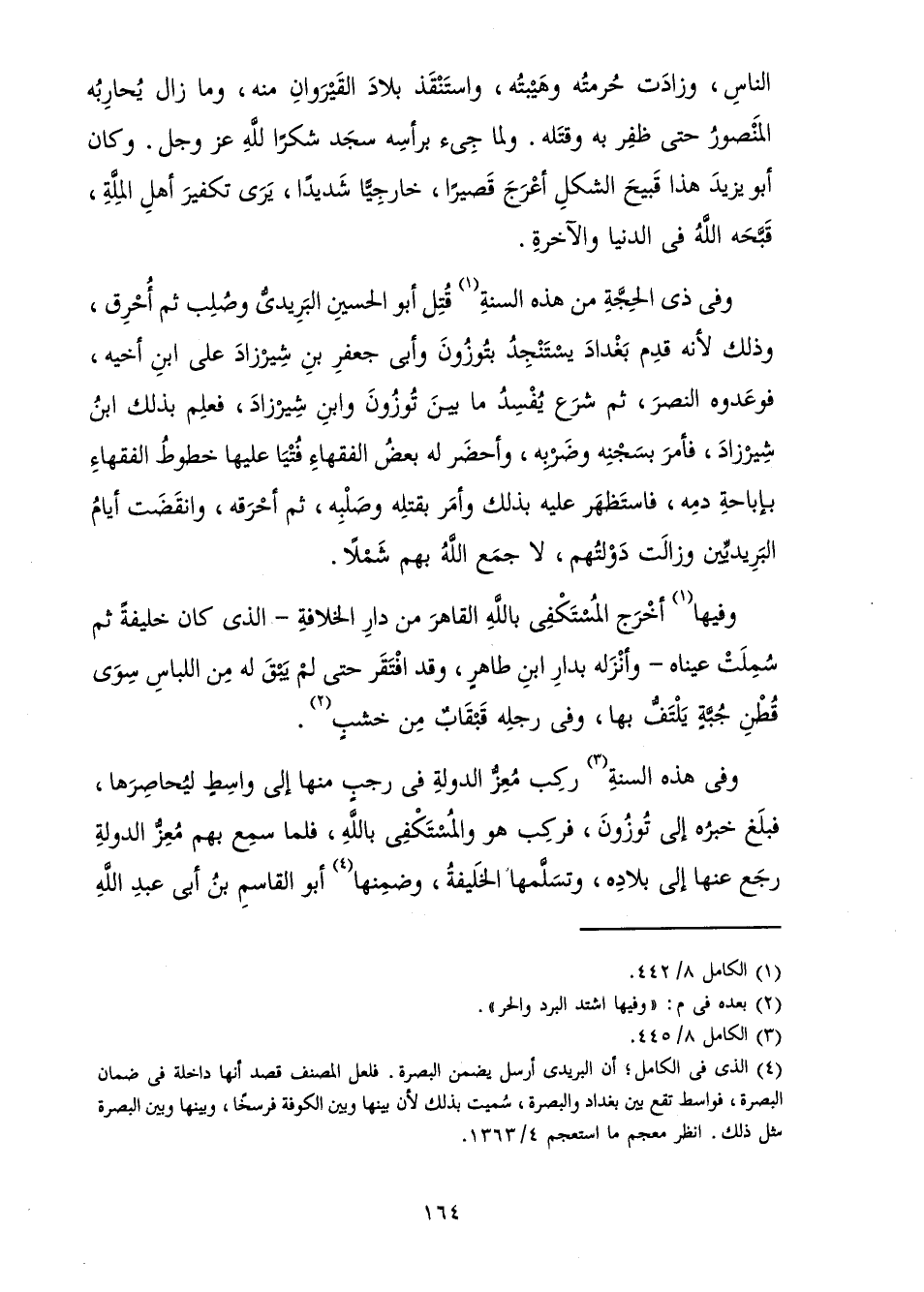 وَفِي ذِي الْحِجَّةِ مِنْ هَذِهِ السَّنَةِ قُتِلَ أَبُو الْحُسَيْنِ الْبَرِيدِيُّ وَصُلِبَ ثُمَّ أُحْرِقَ، وَذَلِكَ لِأَنَّهُ قَدِمَ بَغْدَادَ يَسْتَنْجِدُ بَتُوزُونَ وَأَبِي جَعْفَرِ بْنِ شِيرَزَادَ عَلَى ابْنِ أَخِيهِ، فَوَعَدُوهُ النَّصْرَ، ثُمَّ شَرَعَ يُفْسِدُ مَا بَيْنَ تُوزُونَ وَابْنِ شِيرَزَادَ، فَعَلِمَ بِذَلِكَ ابْنُ شِيرَزَادَ، فَأَمَرَ بِسَجْنِهِ وَضَرْبِهِ، وَأَحْضَرَ لَهُ بَعْضُ الْفُقَهَاءِ فُتْيَا عَلَيْهَا خُطُوطُ الْفُقَهَاءِ بِإِبَاحَةِ دَمِهِ، فَاسْتَظْهَرَ عَلَيْهِ بِذَلِكَ وَأَمَرَ بِقَتْلِهِ وَصَلْبِهِ، ثُمَّ أَحْرَقَهُ، وَانْقَضَتْ أَيَّامُ الْبَرِيدِيِّينَ وَزَالَتْ دَوْلَتُهُمْ، لَا جَمَعَ اللَّهُ بِهِمْ شَمَلًا.