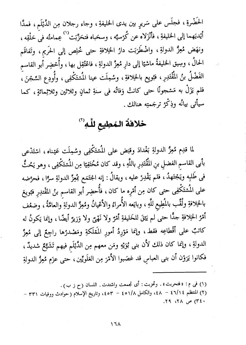 لَمَّا قَدِمَ مُعِزُّ الدَّوْلَةِ بَغْدَادَ وَقَبَضَ عَلَى الْمُسْتَكْفِي وَسُمِلَتْ عَيْنَاهُ، اسْتَدْعَى بِأَبِي الْقَاسِمِ الْفَضْلِ بْنِ الْمُقْتَدِرِ بِاللَّهِ، وَقَدْ كَانَ مُخْتَفِيًا مِنَ الْمُسْتَكْفِي، وَهُوَ يَحُثُّ فِي طَلَبِهِ وَيَجْتَهِدُ، فَلَمْ يَقْدِرْ عَلَيْهِ، وَيُقَالُ: إِنَّهُ اجْتَمَعَ بِمُعِزِّ الدَّوْلَةِ سِرًّا، فَحَرَّضَهُ عَلَى الْمُسْتَكْفِي حَتَّى كَانَ مِنْ أَمْرِهِ مَا كَانَ، فَأُحْضِرَ أَبُو الْقَاسِمِ بْنُ الْمُقْتَدِرِ فَبُويِعَ بِالْخِلَافَةِ وَلُقِّبَ بِالْمُطِيعِ لِلَّهِ، وَبَايَعَهُ الْأُمَرَاءُ وَالْأَعْيَانُ وَمُعِزُّ الدَّوْلَةِ وَالْعَامَّةُ، وَضَعُفَ أَمْرُ الْخِلَافَةِ جِدًّا حَتَّى لَمْ يَبْقَ لِلْخَلِيفَةِ أَمْرٌ وَلَا نَهْيٌ وَلَا وَزِيرٌ أَيْضًا، وَإِنَّمَا يَكُونُ لَهُ كَاتِبٌ عَلَى أَقْطَاعِهِ فَقَطْ، وَإِنَّمَا مَوْرِدُ أُمُورِ الْمَمْلَكَةِ وَمَصْدَرُهَا رَاجِعٌ إِلَى مُعِزِّ الدَّوْلَةِ، وَإِنَّمَا كَانَ ذَلِكَ لِأَنَّ بَنِي بُوَيْهِ وَمِنْ مَعَهُمْ مِنَ الدَّيْلَمِ فِيهِمْ تَشَيُّعٌ شَدِيدٌ، فَكَانُوا يَرَوْنَ أَنَّ بَنِي الْعَبَّاسِ قَدْ غَصَبُوا الْأَمْرَ مِنَ الْعَلَوِيِّينَ، حَتَّى عَزَمَ مُعِزُّ الدَّوْلَةِ