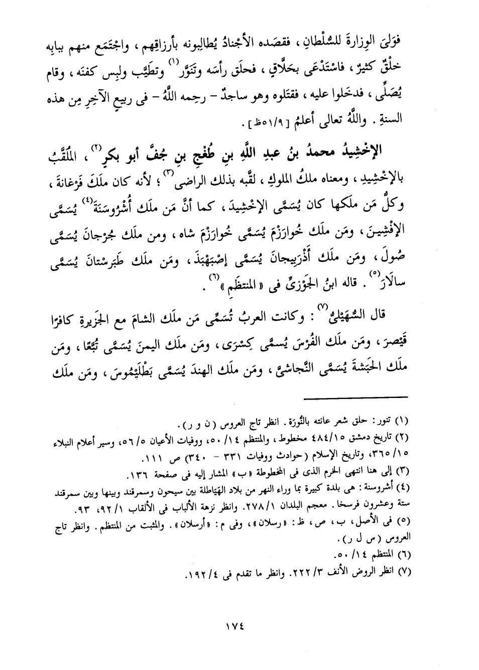 الْمُلَقَّبَ بِالْإِخْشِيدِ، وَمَعْنَاهُ مَلِكُ الْمُلُوكِ، لَقَّبَهُ بِذَلِكَ الرَّاضِي ; لِأَنَّهُ كَانَ مَلِكَ فَرْغَانَةَ وَكُلُّ مَنْ مَلَكَهَا كَانَ يُسَمَّى الْإِخْشِيدَ كَمَا أَنَّ مَنْ مَلَكَ أُشْرُوسَنَةَ يُسَمَّى الْإِفْشِينَ، وَمَنْ مَلَكَ خُوَارِزْمَ يُسَمَّى خَوَارِزْمَ شَاهَ، وَمَنْ مَلَكَ جُرْجَانَ يُسَمَّى صُولَ، وَمَنْ مَلَكَ أَذْرَبِيجَانَ يُسَمَّى إِصْبَهْبَذَ، وَمَنْ مَلَكَ طَبَرِسْتَانَ يُسَمَّى سَالَارَ. قَالَهُ ابْنُ الْجَوْزِيِّ فِي " الْمُنْتَظَمِ ".