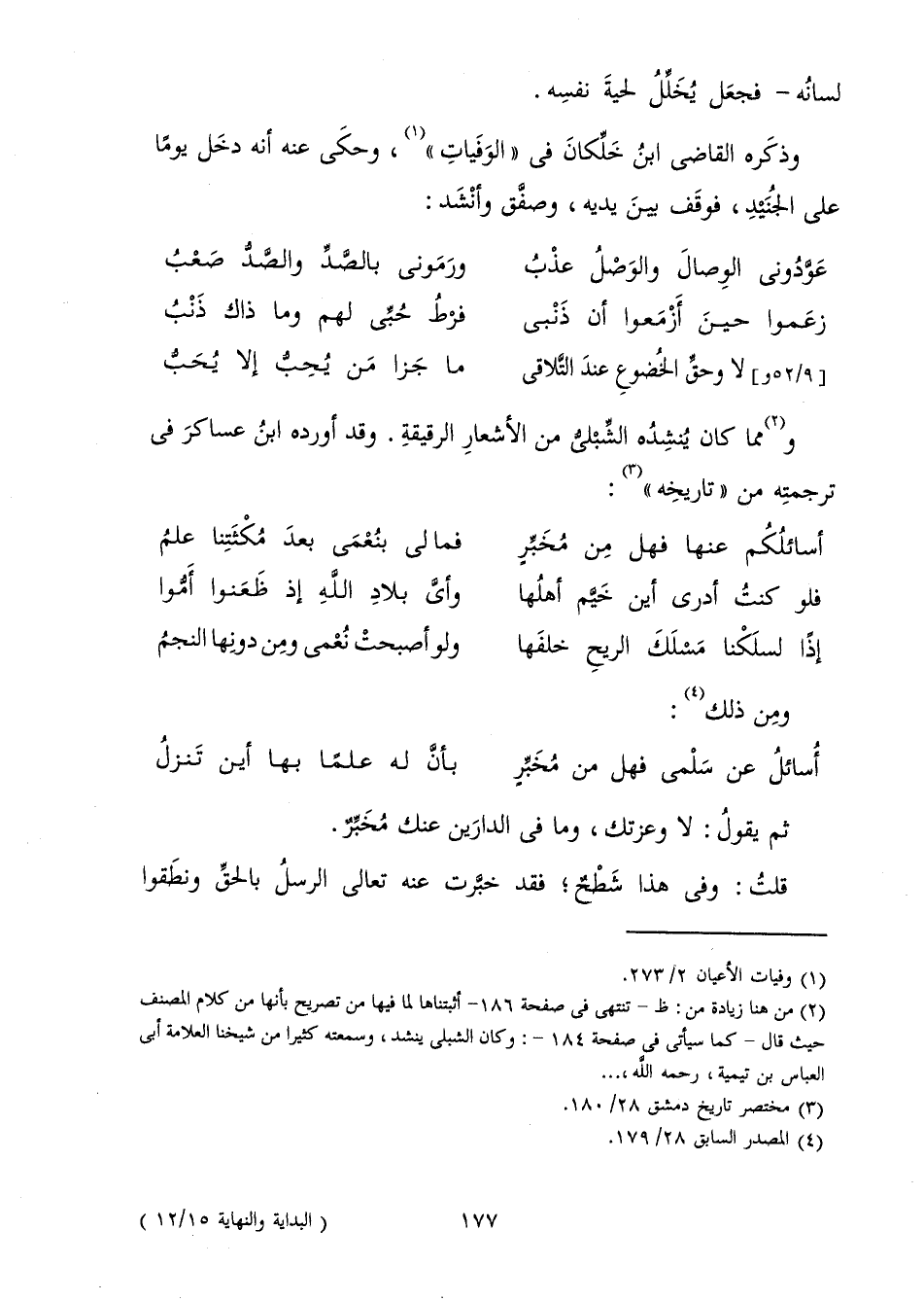 وَمِمَّا كَانَ يُنْشِدُهُ الشِّبْلِيُّ مِنَ الْأَشْعَارِ الرَّقِيقَةِ، وَقَدْ أَوْرَدَهُ ابْنُ عَسَاكِرَ فِي تَرْجَمَتِهِ مِنْ " تَارِيخِهِ ":