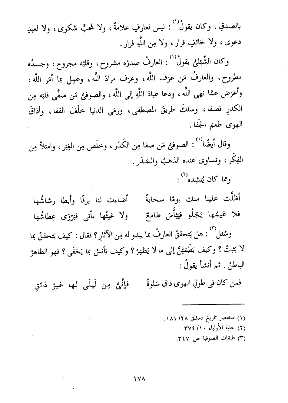 وَكَانَ الشِّبْلِيُّ يَقُولُ: الْعَارِفُ صَدْرُهُ مَشْرُوحٌ، وَقَلْبُهُ مَجْرُوحٌ، وَجَسَدُهُ مَطْرُوحٌ، وَالْعَارِفُ مَنْ عَرَفَ اللَّهَ، وَعَرَفَ مُرَادَ اللَّهِ، وَعَمِلَ بِمَا أَمَرَ اللَّهُ، وَأَعْرَضَ عَمَّا نَهَى اللَّهُ، وَدَعَا عِبَادَ اللَّهِ إِلَى اللَّهِ، وَالصُّوفِيُّ مَنْ صَفَّى قَلْبَهُ مِنَ الْكَدَرِ فَصَفَا، وَسَلَكَ طَرِيقَ الْمُصْطَفَى، وَرَمَى الدُّنْيَا خَلْفَ الْقَفَا، وَأَذَاقَ الْهَوَى طَعْمَ الْجَفَا.